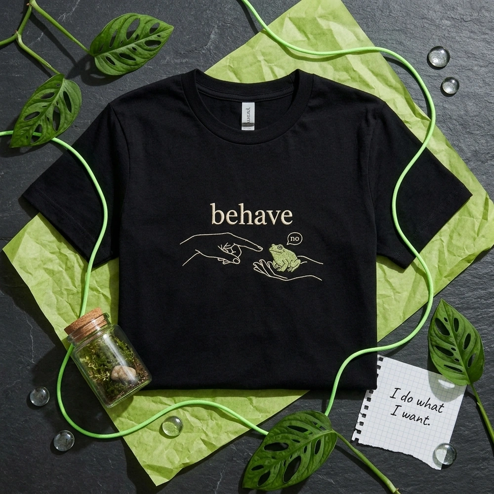 This design is inspired by modern internet meme culture, specifically the “stubborn frog” and “behave… no” webcomic tropes. It captures the humorous defiance and minimalist illustrative style popular in online frogcore communities.