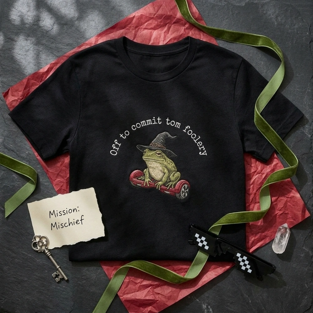 This design is expertly rendered on a sand-colored garment, providing a neutral canvas that makes the vibrant thread colors pop. The centerpiece is a charmingly unhinged green frog, brought to life with a dense moss-green fill stitch and black stippling to mimic a bumpy, amphibian texture. He sports a floppy wizard’s hat in dark charcoal satin stitching with light grey highlights for a weathered, magical look. Riding a crimson red hoverboard with metallic silver-grey wheel hubs, this frog is the epitome of the “tomfoolery” lifestyle. The 10cm x 12cm embroidery uses five distinct thread colors and features a crisp, typewriter-style font arched above the character.