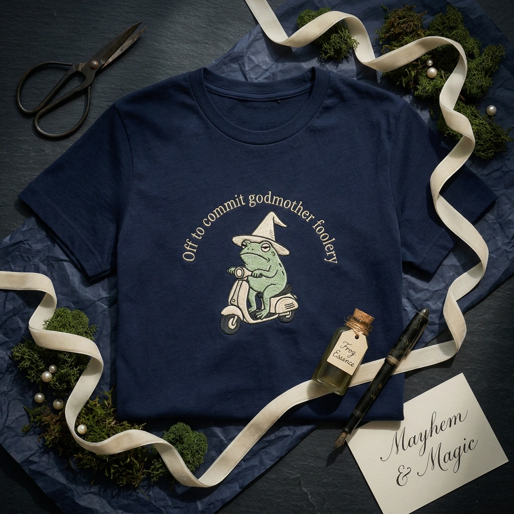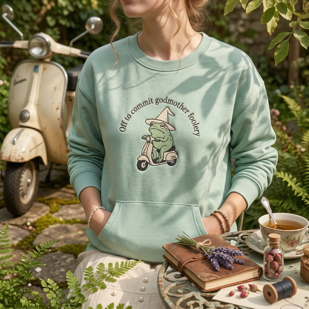 This high-quality embroidery features a characterful frog riding an electric scooter while sporting a tall, cream-colored wizard hat. The design measures 15cm x 18cm and uses 4 distinct thread colors for a premium finish. We use a crisp cream satin stitch for the “Off to commit godmother foolery” text and the wizard hat, while the frog’s body is rendered in a soft sage green fill. Precise dark charcoal running stitches define the mechanical parts of the scooter and the frog’s grumpy expression, all set against a beautiful light green/mint garment.