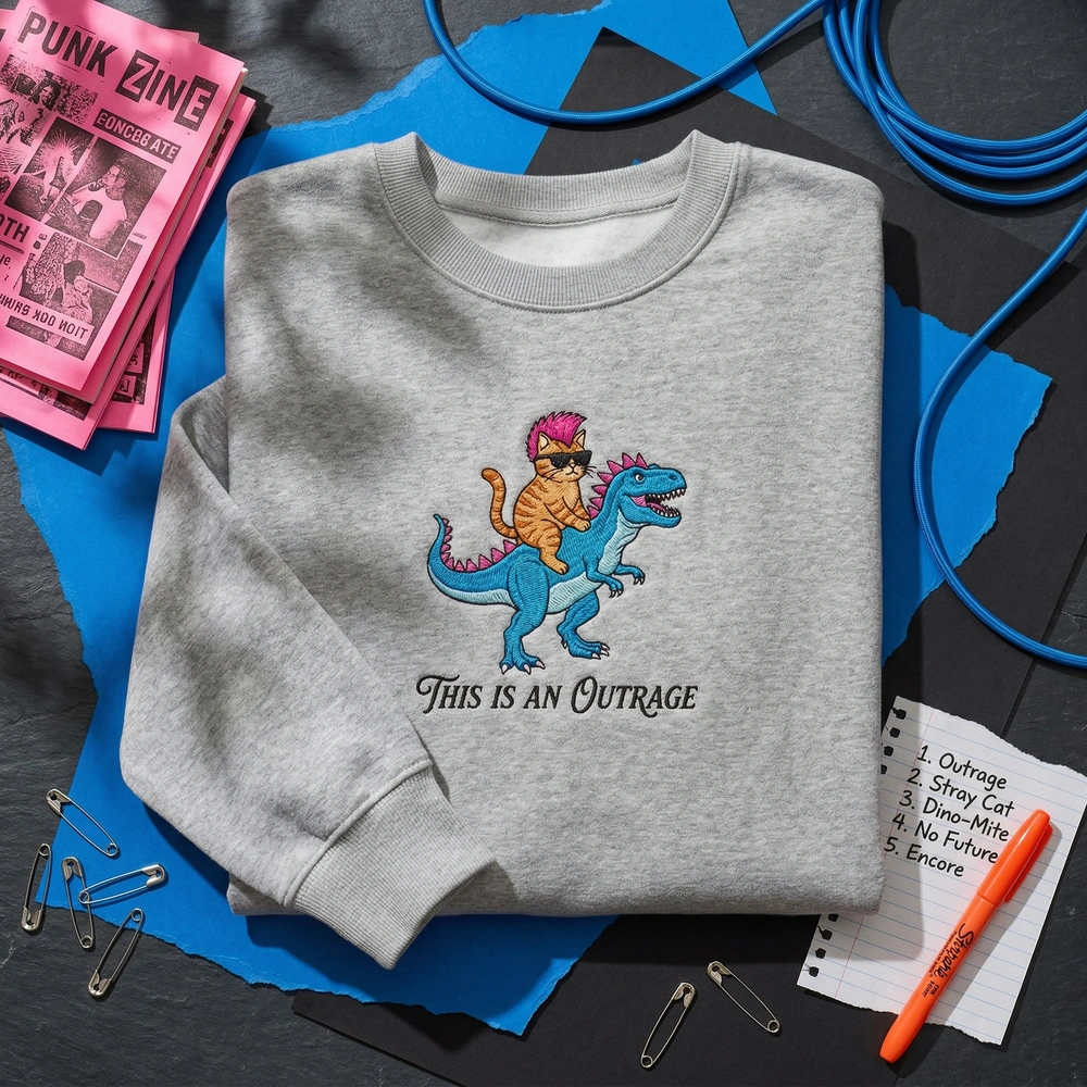 This intricate embroidery composition measures approximately 18cm x 16cm and utilizes 6 vibrant thread colors to bring the chaos to life. The design features a Royal Blue raptor-style dinosaur adorned with Hot Pink dorsal spines. Perched on top is a Ginger Orange fluffy cat sporting a punk-rock pink mohawk and cool black sunglasses, raising a defiant paw. The phrase ‘THIS IS AN OUTRAGE’ is rendered in crisp, bold black satin stitching. Every stitch is placed with precision on a clean white garment to ensure the colors pop and the texture feels premium to the touch.