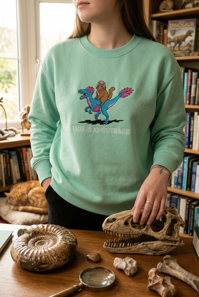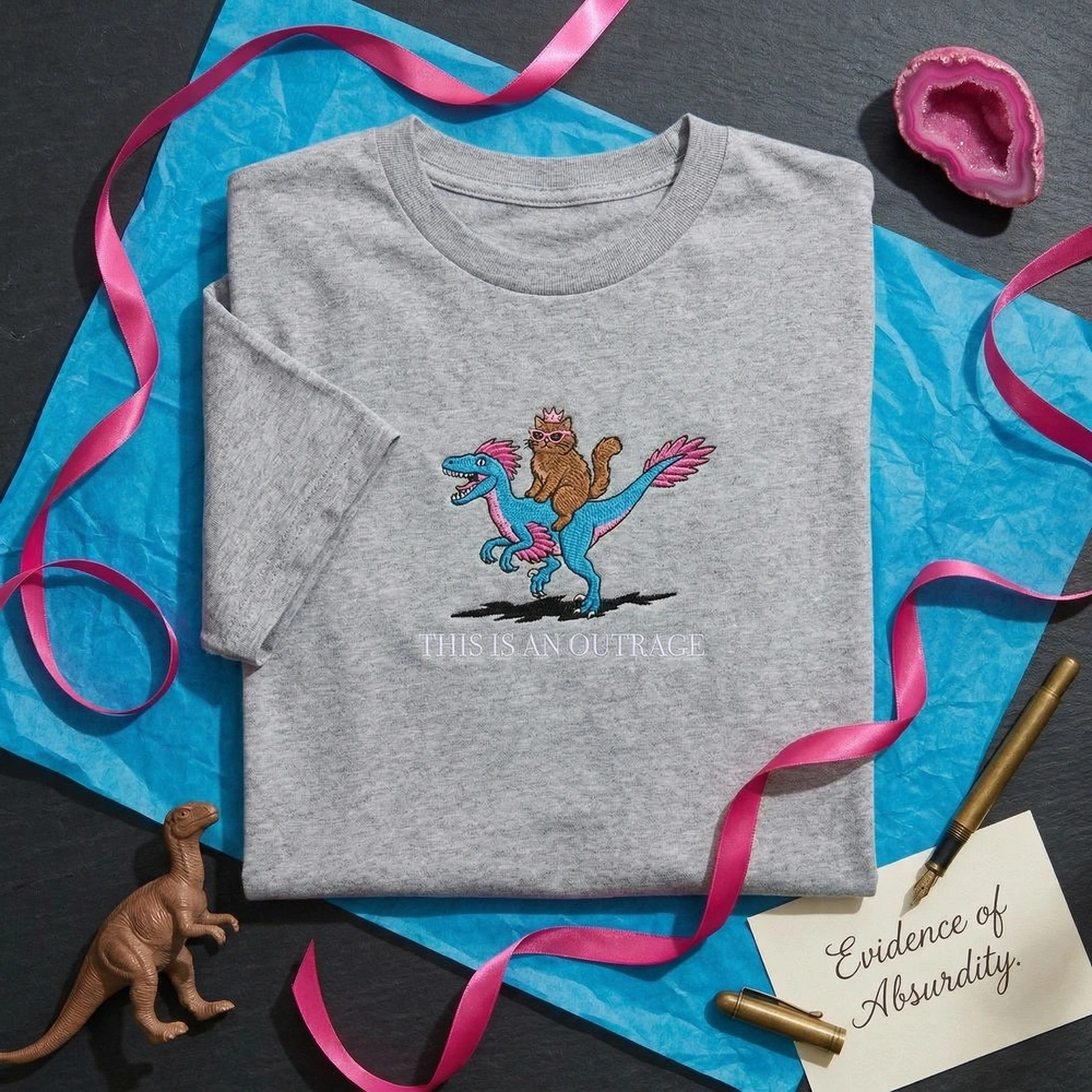This high-quality embroidery features a vibrant blue feathered theropod dinosaur, expertly detailed with black contour lines and bright pink accents on the head and tail. Perched atop the raptor is a textured brown cat wearing pink-tinted sunglasses and a royal crown. The entire scene is grounded by a jagged shadow line and finished with the phrase “THIS IS AN OUTRAGE” in clean, white satin-stitch serif lettering. Measuring 12cm x 10cm and utilizing 5 premium thread colors (Bright Blue, Hot Pink, Medium Brown, Stark White, and Solid Black), this design pops beautifully against the Bay (Mint Green) garment color.