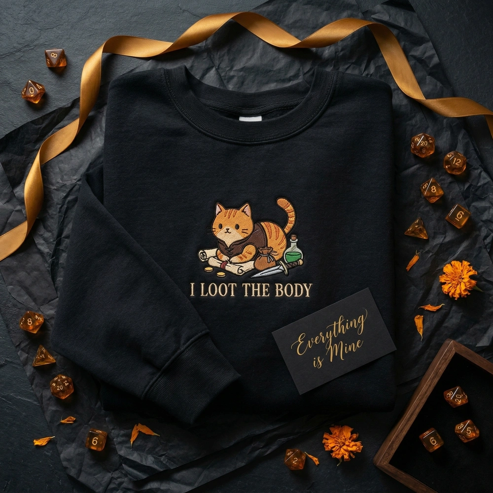 Whether your cat sits on your keyboard or your character sheet, this design captures that universal “I called dibs” energy. It is the perfect cat sits on things sweatshirt for tabletop gamers who know that in the world of feline logic, everything is loot. This cozy crewneck combines high-fantasy roleplaying with relatable pet behavior, making it a standout piece for your next campaign. Browse more embroidered sweatshirts in our collection to find your next favorite gaming fit.
