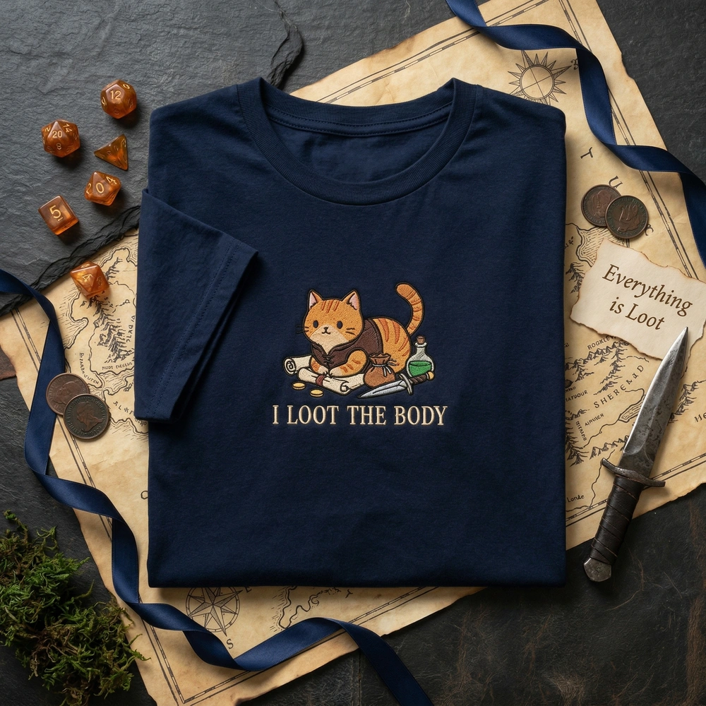 It is a popular phrase in tabletop RPGs like Dungeons & Dragons, usually shouted by the Rogue of the party immediately after a combat encounter ends. We’ve paired it with a cat because, as every cat owner knows, cats are the ultimate looters of our personal space.