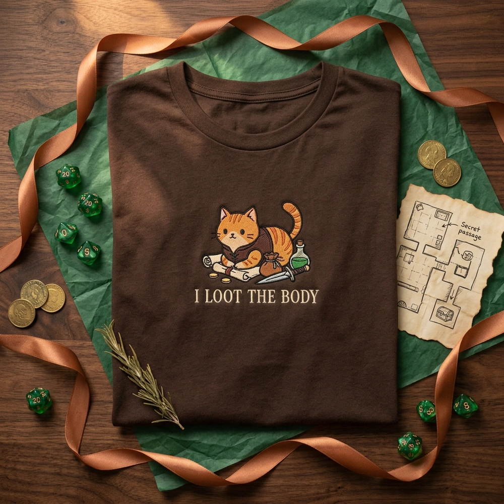 This design is expertly digitized for machine embroidery, ensuring clean lines and bold color blocks that pop against the deep Espresso garment. The 15cm x 14cm embroidery features a chibi-style orange tabby cat in a classic “loaf” position, sitting possessively atop a pile of loot including a scroll, a coin pouch, a dagger, and a glowing green potion. The character wears a detailed dark leather rogue’s vest with tiny belt pouches. We use five distinct thread colors—Vibrant Orange, Leather Brown, Gold, Potion Green, and a Deep Charcoal outline—to bring this smug little thief to life.