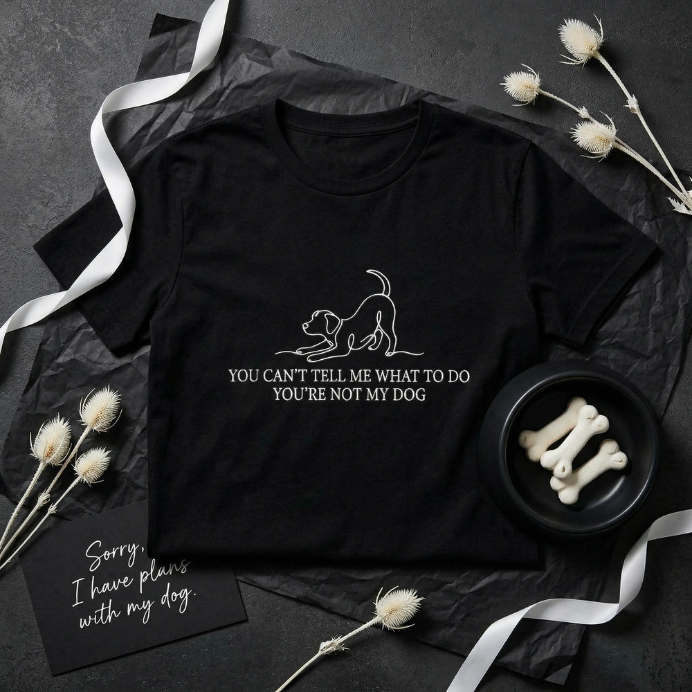 This design features a high-contrast white #FFFFFF thread embroidered onto a premium Military Green garment. The artwork showcases a continuous single-line drawing of a dog in a playful ‘play bow’ stretch, measuring approximately 18cm x 12cm. Below the minimalist icon, the phrase ‘you can’t tell me what to do you’re not my dog’ is rendered in a sophisticated serif typography. The center-chest placement ensures maximum legibility while maintaining a modern, minimalist aesthetic that sets it apart from typical screen-printed apparel.