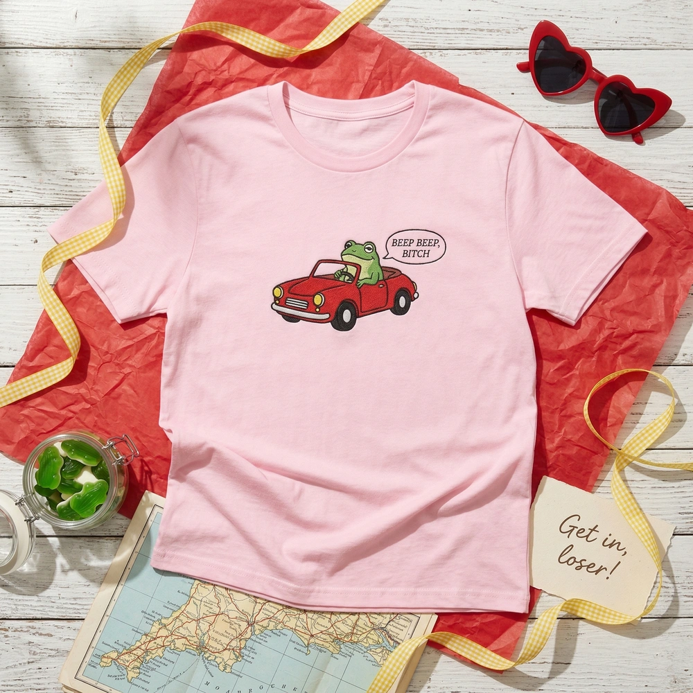 This design is expertly crafted using high-density machine embroidery on a premium Seafoam (Mint Green) garment. The artwork features a vibrant green cartoon frog behind the wheel of a bright red convertible, complete with yellow headlights and a tiny steering wheel. Measuring approximately 10cm x 8cm, the embroidery uses a 5-color palette (Frog Green, Car Red, White, Black, and Yellow) with thick black satin stitch outlines to ensure the cartoonish elements pop. The ‘BEEP BEEP, BITCH’ text is rendered in precise, clean satin stitching for maximum legibility and a professional finish that resists puckering.