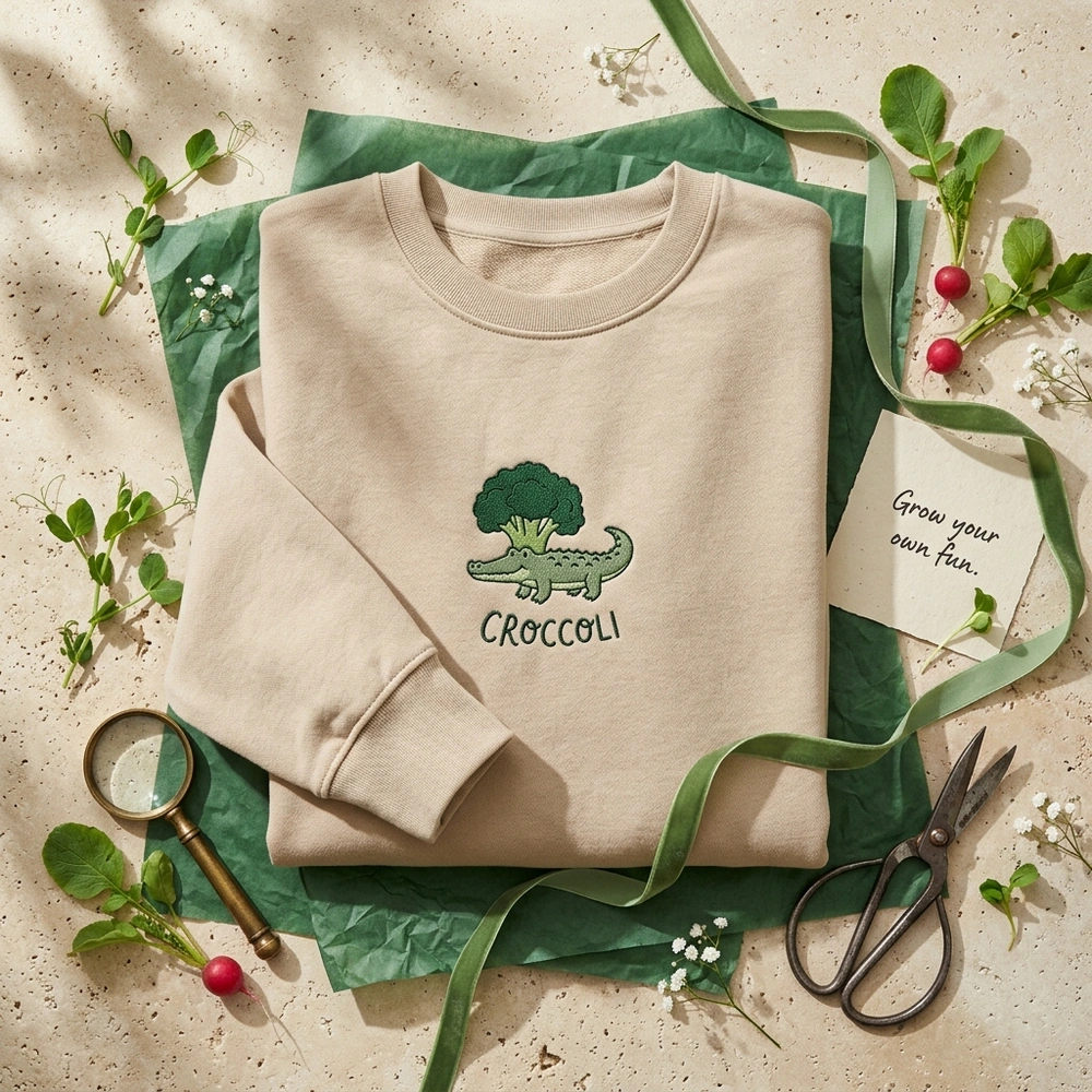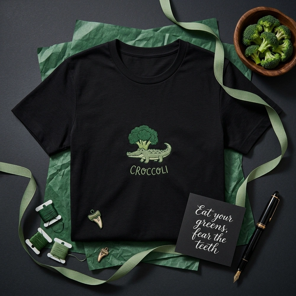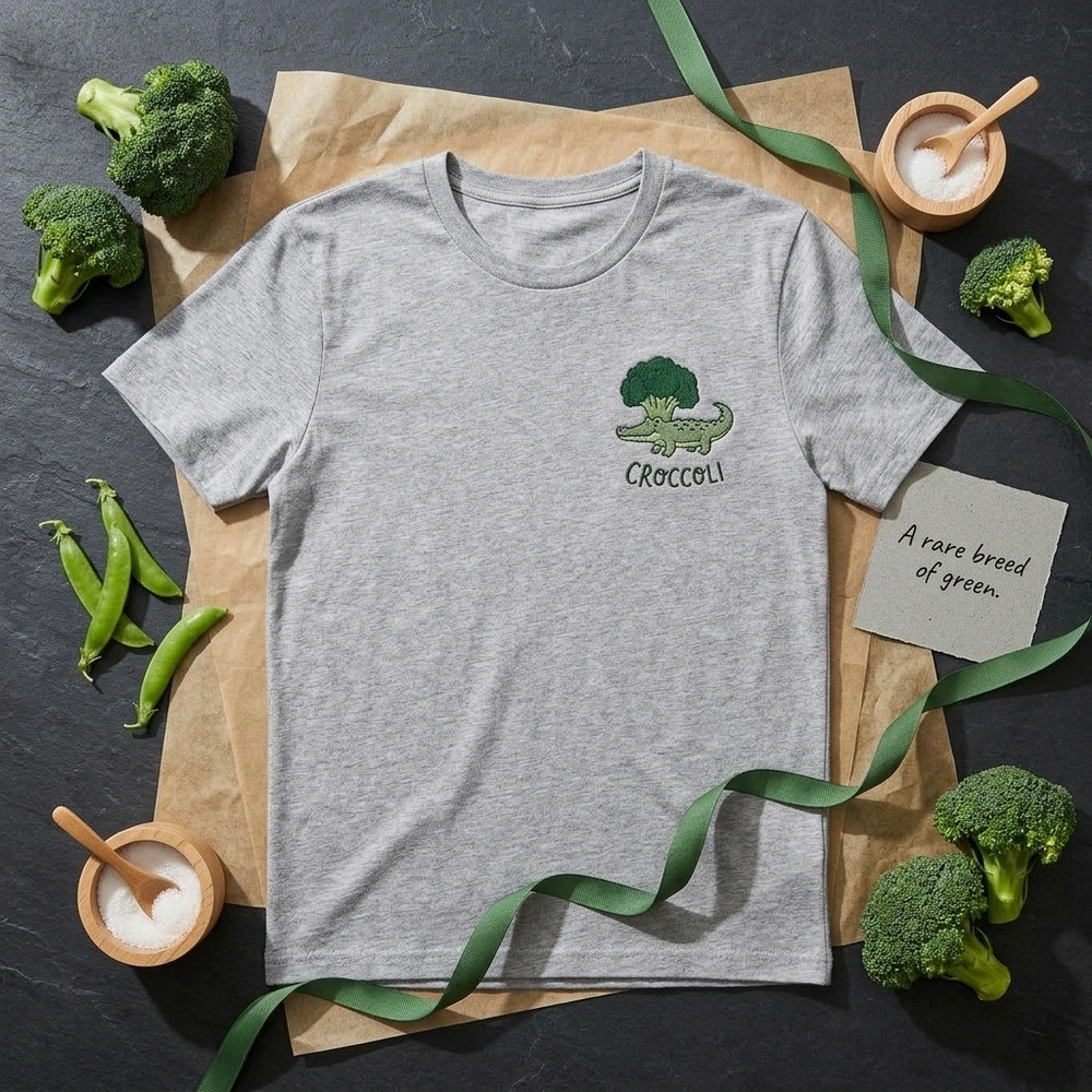 A Croccoli is our original visual pun—a delightful blend of a crocodile and a head of broccoli. It combines the “crunch” of a vegetable with the “snap” of a reptile for a truly unique piece of vegan humor clothing.