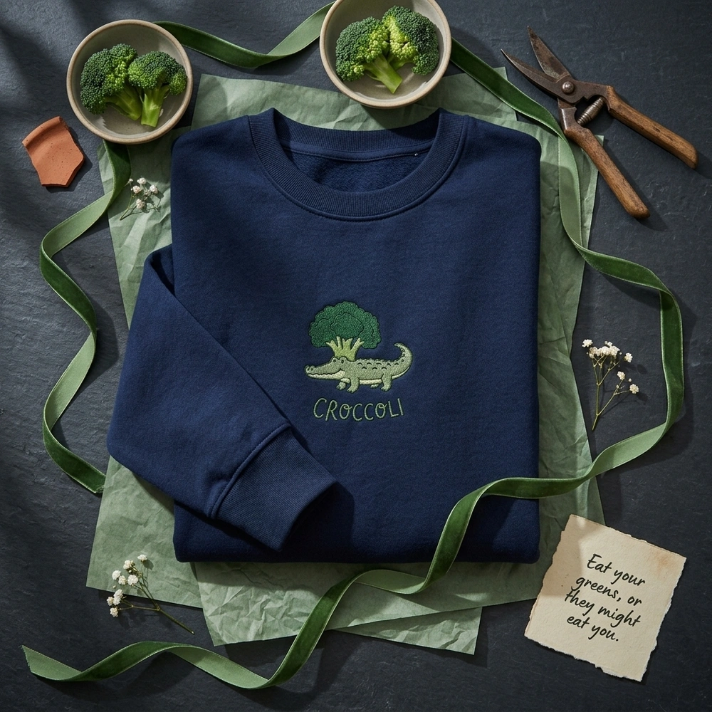 Funny vegetable pun embroidered sweatshirt featuring the “Croccoli” — a hilarious crocodile broccoli hybrid. Perfect vegetarian gift or vegan humor clothing.