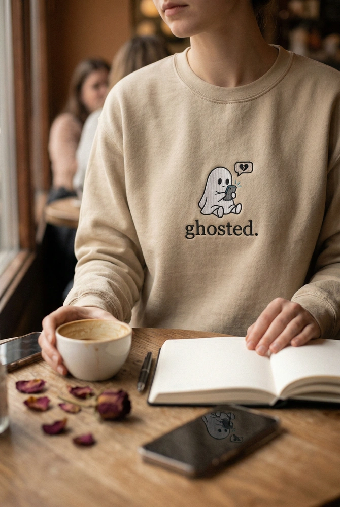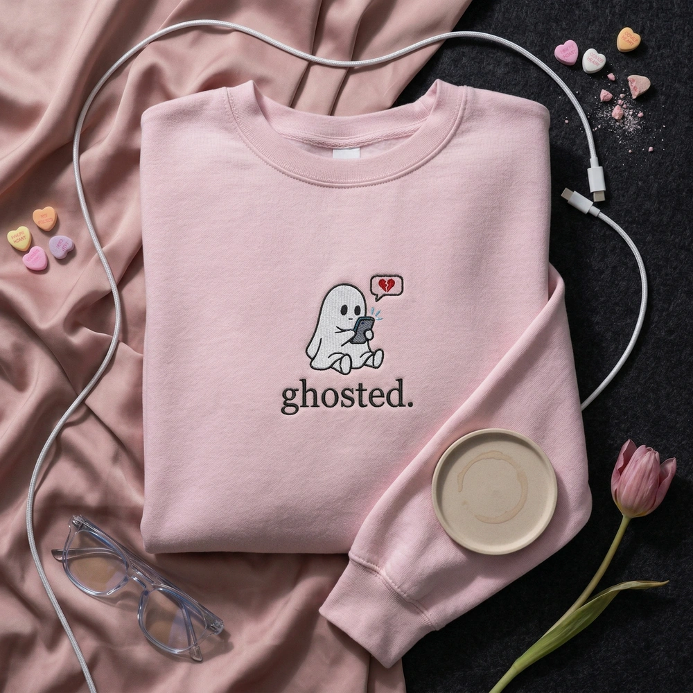 The ghosted sweatshirt is a premium machine-embroidered sweatshirt featuring a cute ghost looking at its phone—the ultimate funny dating hoodie for Gen Z.