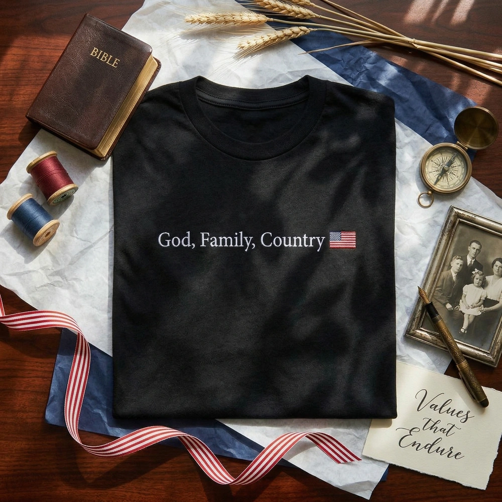 This design represents a clear hierarchy of traditional values—God, Family, and Country—inspired by the mission to restore foundational principles within our nation. It features a quote and signature from a prominent conservative leader.