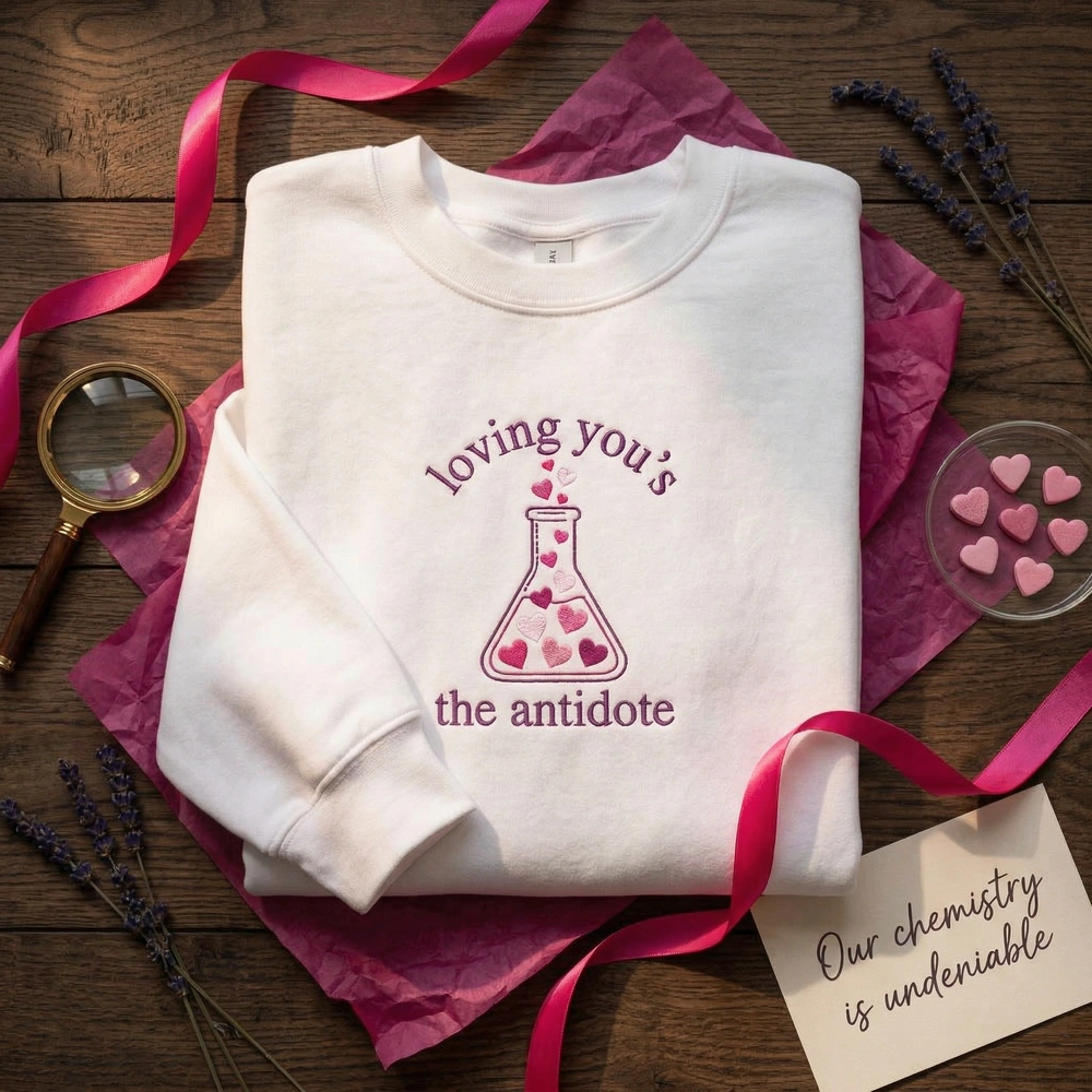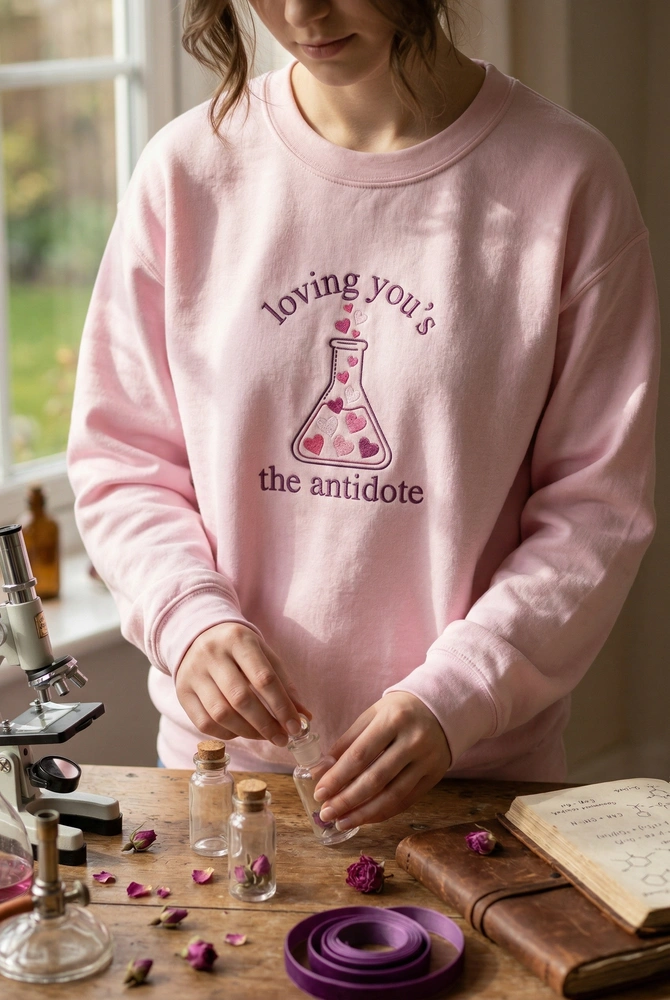Celebrate the science of romance with this unique design that blends poetic lyrics with a STEM-inspired visual. Whether you are a dedicated music fan looking for a subtle way to represent your favorite album or a science enthusiast who loves a good pun, this soft light pink crewneck offers the perfect balance of cozy comfort and high-quality craftsmanship. Browse more embroidered sweatshirts or find the perfect couple sweatshirt in our full collection.