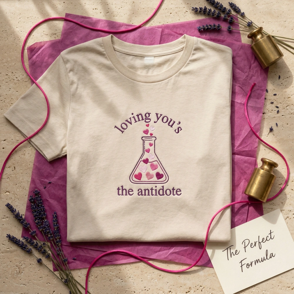 This design is expertly stitched on a soft light pink garment, creating a gentle and romantic backdrop for the detailed embroidery. The center-chest piece features a classic Erlenmeyer chemistry flask outlined in a rich dark plum thread. Inside the flask, a collection of hearts is densely embroidered using a textured fill stitch in three distinct shades: soft light pink, vibrant medium pink, and deep magenta. Delicate hearts float out of the flask, adding motion to the piece. The arched serif typography ‘loving you’s’ and the straight line ‘the antidote’ are executed in a neat satin stitch that matches the dark plum outline. The entire composition measures approximately 10cm wide by 12cm tall, ensuring a high-impact look that remains minimalist and chic.