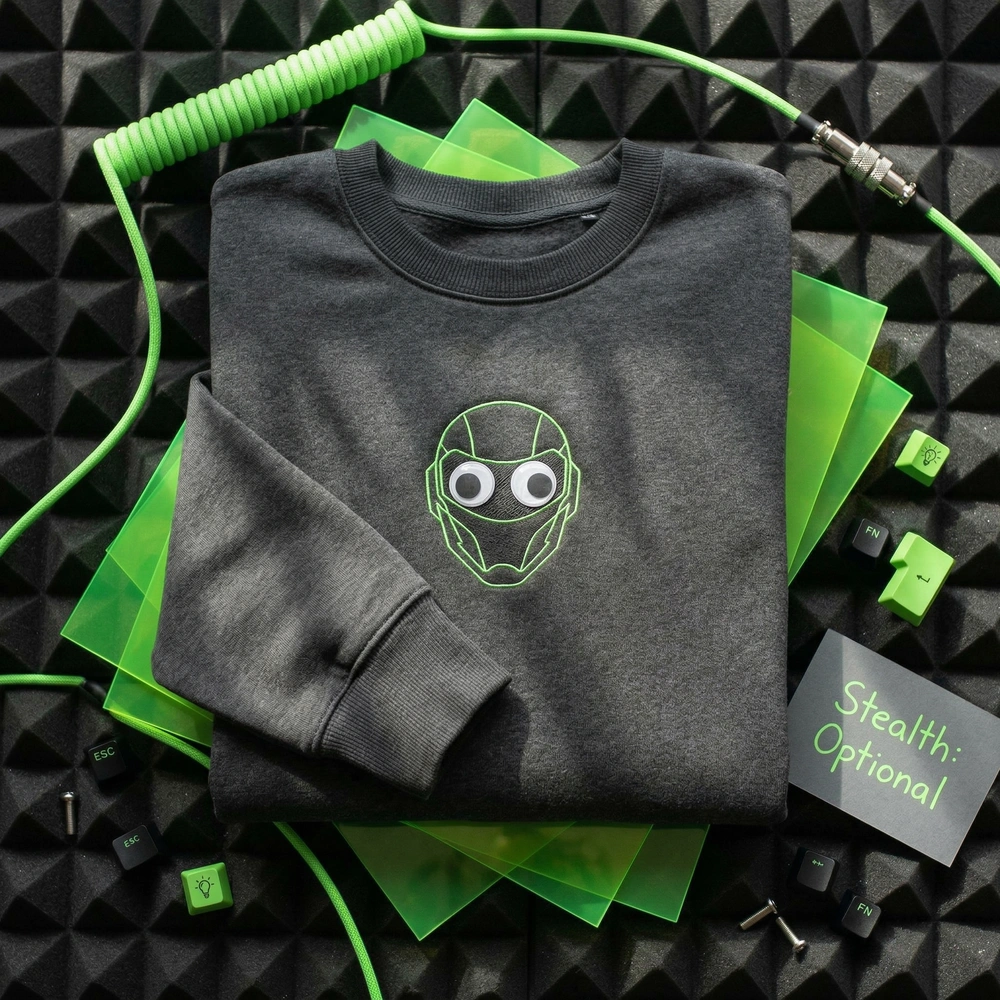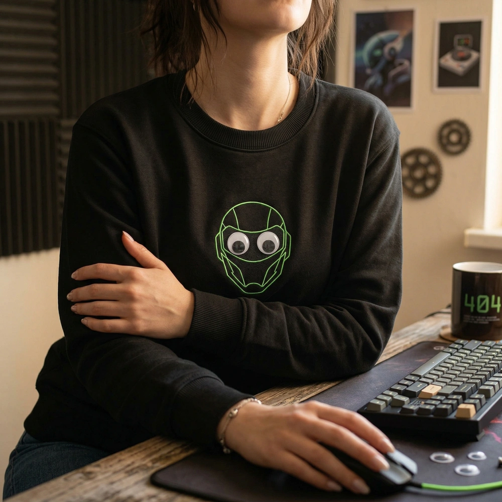 The Googly Eyes Embroidered Sweatshirt features a sleek cyborg ninja design with a hilarious April Fools twist, perfect for gamers and meme lovers.