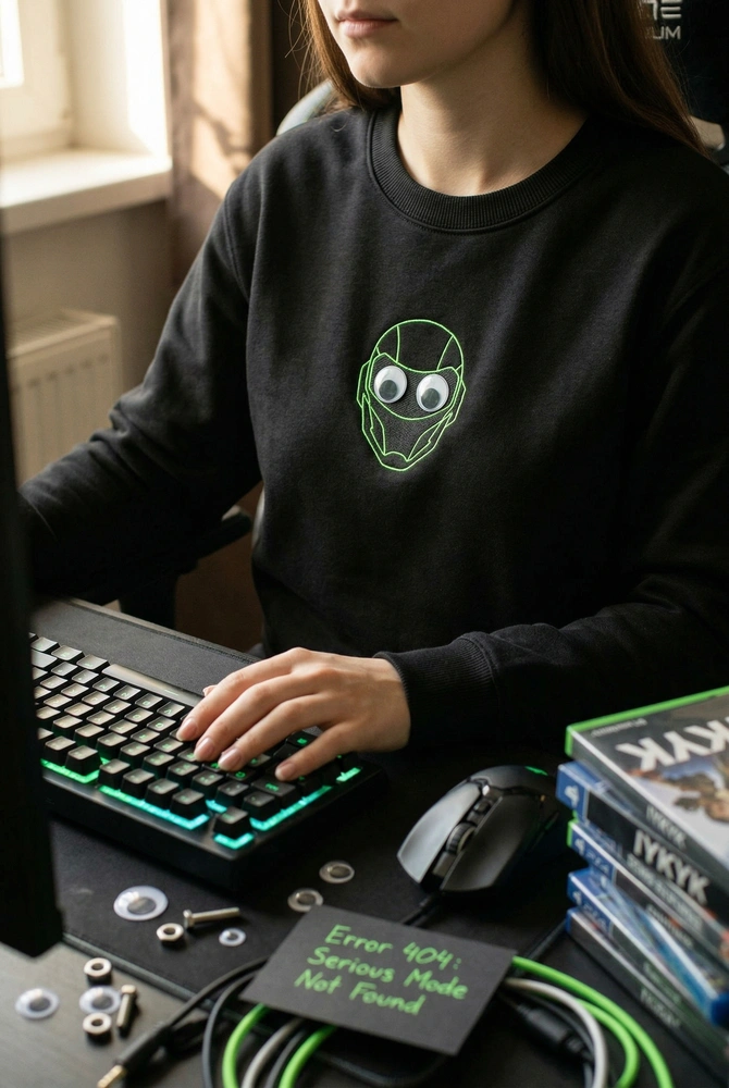 This high-quality piece captures the peak of gaming humor—that moment when the edgiest hero in the roster gets slapped with googly eyes during a patch update. Whether you’re grinding ranked or hanging out at a local arcade, this sweatshirt is a subtle nod to fellow FPS fans who know the joke. Browse more embroidered sweatshirts in our collection to find your next gaming-inspired look.