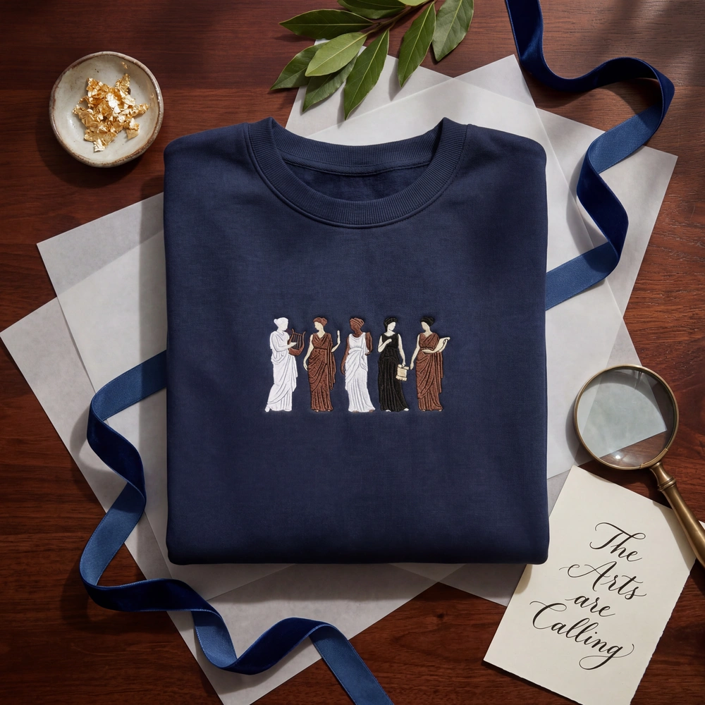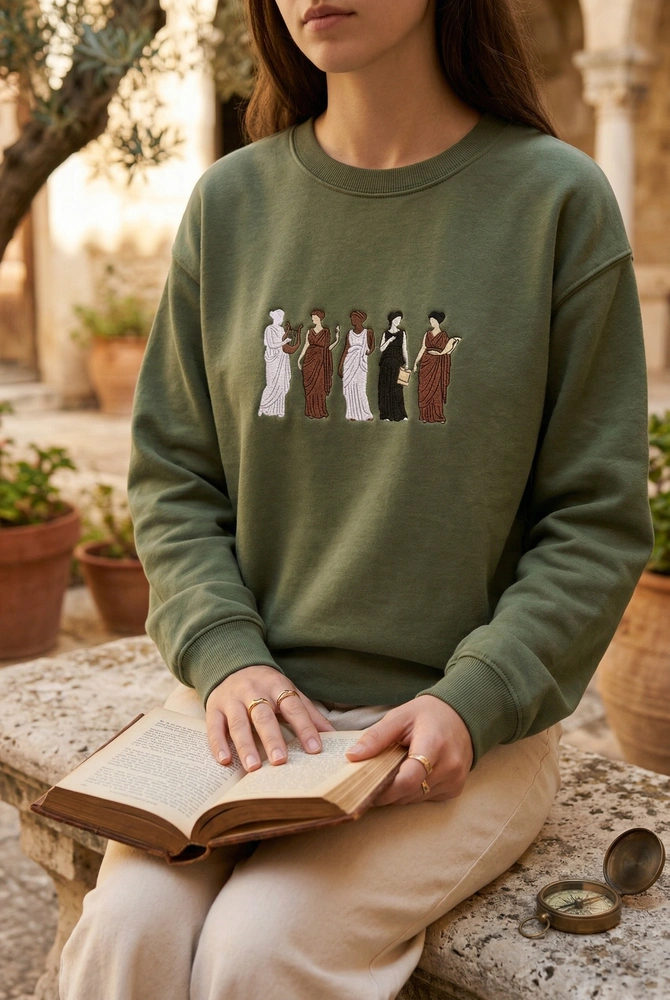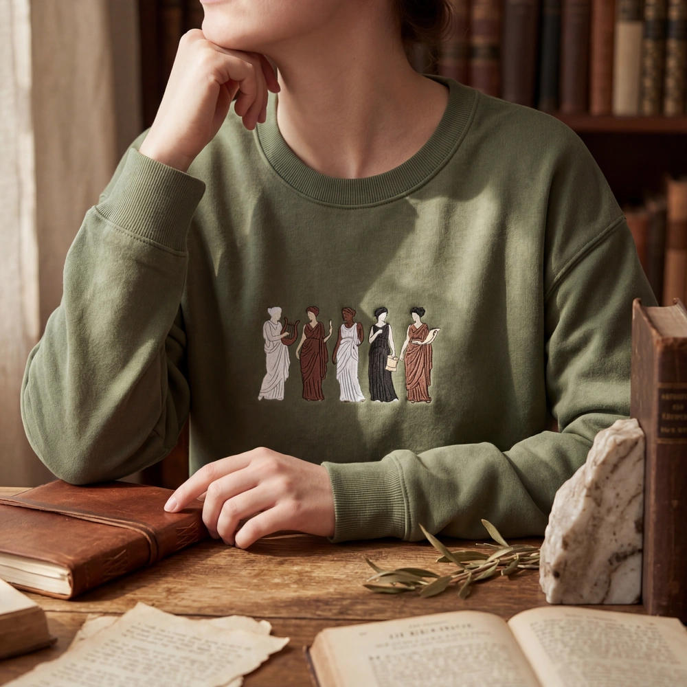 This center-chest composition features five faceless silhouettes captured in their most iconic, dynamic poses. Measuring 18cm x 8cm, the embroidery utilizes over 15,000 stitches to ensure a dense, high-quality finish. We use a sophisticated 3-color palette including Stark White for the Grecian draped dresses, Saddle Brown for the skin tones, and Solid Black for the voluminous hairstyles. The design is rendered in a mix of dense fill stitches and delicate satin stitches for fine details like dress straps and slender limbs, all set against a rich Military Green fabric.