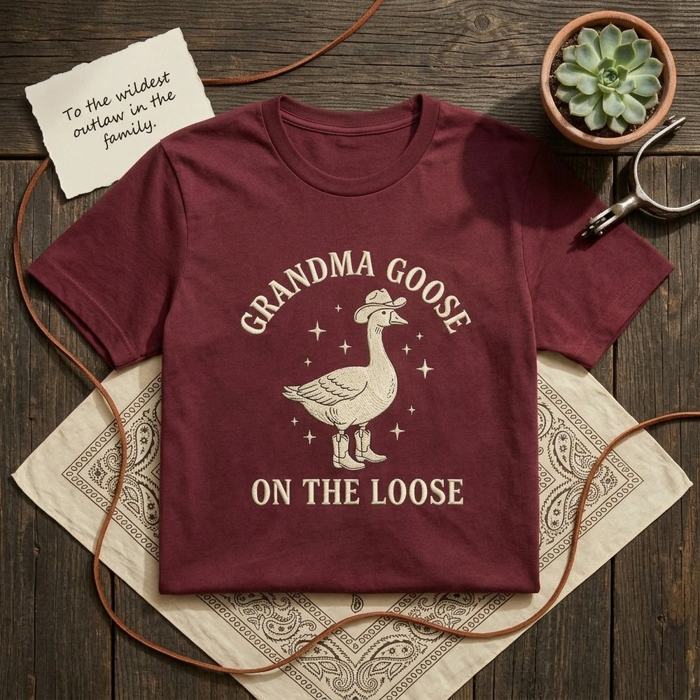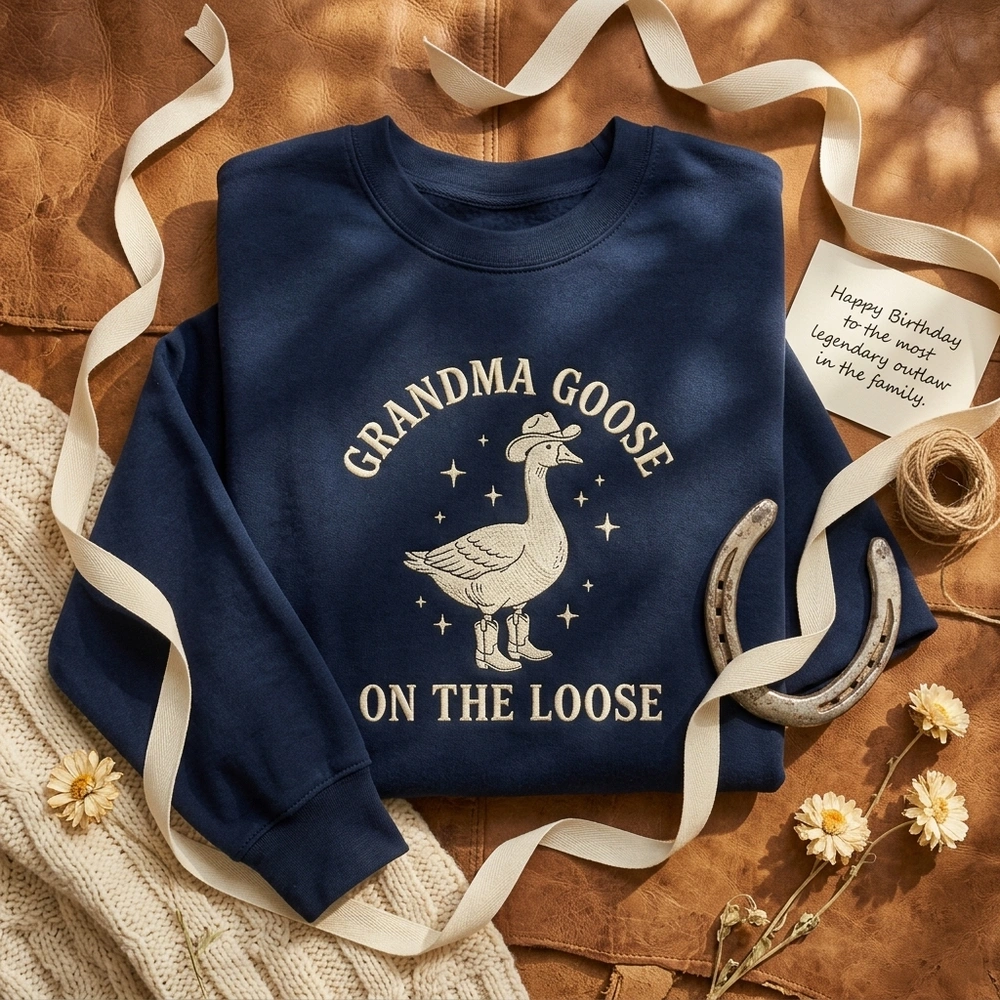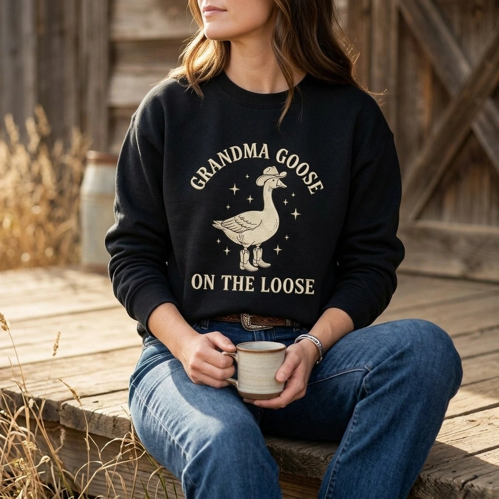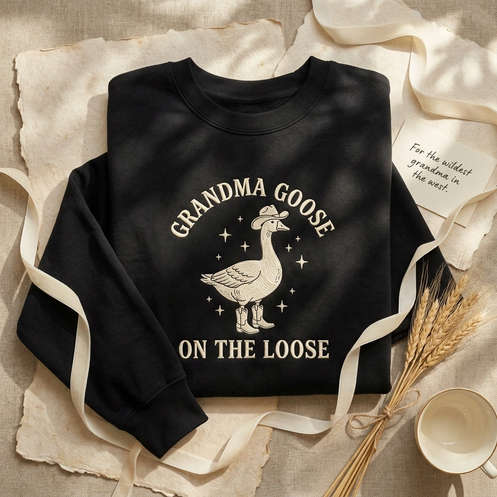 This design perfectly blends the viral silly goose meme with the trendy coastal cowgirl aesthetic, making it a standout piece for the modern grandmother. Whether she’s a fan of western style or just loves a good laugh, this high-quality garment brings a rebellious ‘on the loose’ energy to her wardrobe. Browse more embroidered sweatshirts or find your favorite silly goose shirt in our exclusive collection.