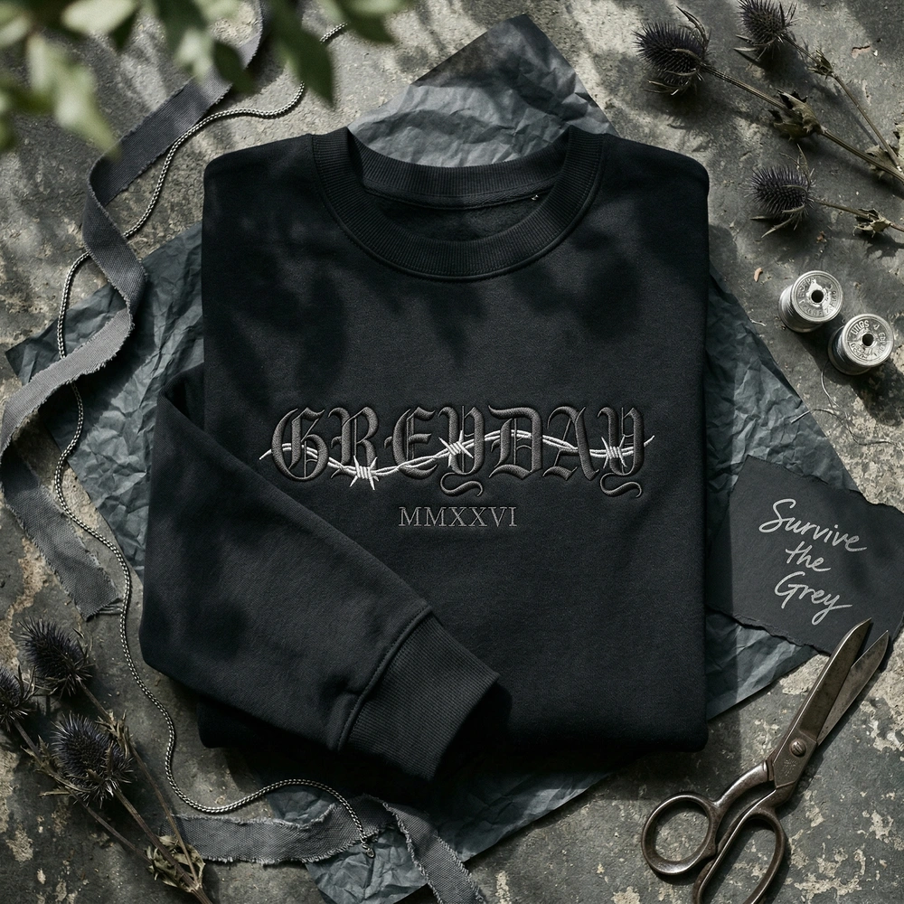 This exclusive design is machine-embroidered with precision on a premium black garment to ensure durability and a professional finish. The upper chest features the word ‘GREYDAY’ in a thick, aggressive gothic font, woven through with sharp, metallic silver barbed wire. Directly beneath, the year ‘MMXXVI’ is rendered in a clean, militaristic stencil. We use a high-contrast palette of #4F4F4F Dark Charcoal and #A9A9A9 Metallic Silver thread. The embroidery measures approximately 24cm x 10cm, providing a bold, high-impact look that stands out in any crowd.