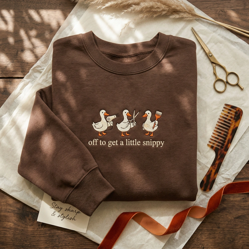 This original design is meticulously machine-embroidered on a rich brown garment, ensuring a high-quality finish that lasts through countless salon shifts. The 18cm x 12cm composition features three distinct duck characters: one wielding a hair dryer and round brush, a center duck in a dark stylist’s apron holding scissors, and a third duck prepared with a tint brush and color bowl. The phrase ‘off to get a little snippy’ is embroidered in a clean, lowercase serif font using a minimalist palette of Cream (#F5F5DC), Dark Orange (#FF8C00), and Coffee Bean Brown (#2B1B17).