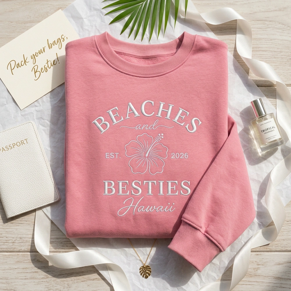 Commemorate your dream tropical getaway with a stylish, matching keepsake that turns every group photo into a core memory. Whether you are walking the beaches of Waikiki or heading to a sunset dinner, these matching bestie shirts create a cohesive, high-end aesthetic for your entire crew. Browse more embroidered sweatshirts or find the perfect bride sweatshirt for the upcoming bachelorette party Hawaii in our curated collection.