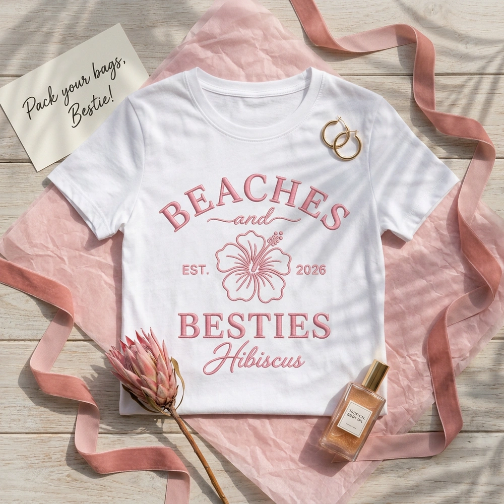 This original design features a large, vertically-stacked center-chest embroidery measuring 25cm x 20cm. The composition starts with “BEACHES” arched in a bold serif font, followed by a delicate cursive “and.” The focal point is a beautifully detailed line-art hibiscus flower, capturing intricate petal veins and textured stamen. Flanking the flower are “EST.” and “2026” markers, with “BESTIES” and a sweeping cursive “Hawaii” anchoring the base. We use a monochromatic thread strategy: soft pink thread on our Sand garment and crisp white thread on the Pink garment for a sophisticated, boutique finish.