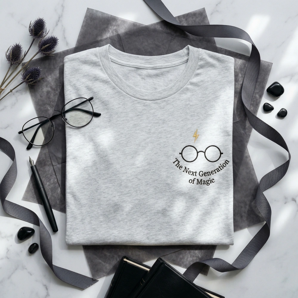 This design features precision machine embroidery on a premium Sand-colored garment. The left-chest placement showcases iconic round wire-rimmed glasses in #000000 Wire Black, topped with a sharp #FFD700 Lightning Gold bolt. Measuring 8cm x 5cm, the delicate single-line embroidery is finished with the clean sans-serif text: ‘The Next Generation of Magic’. The 2-thread color palette ensures a high-contrast yet minimalist look that resonates with the subtle magic apparel trend.