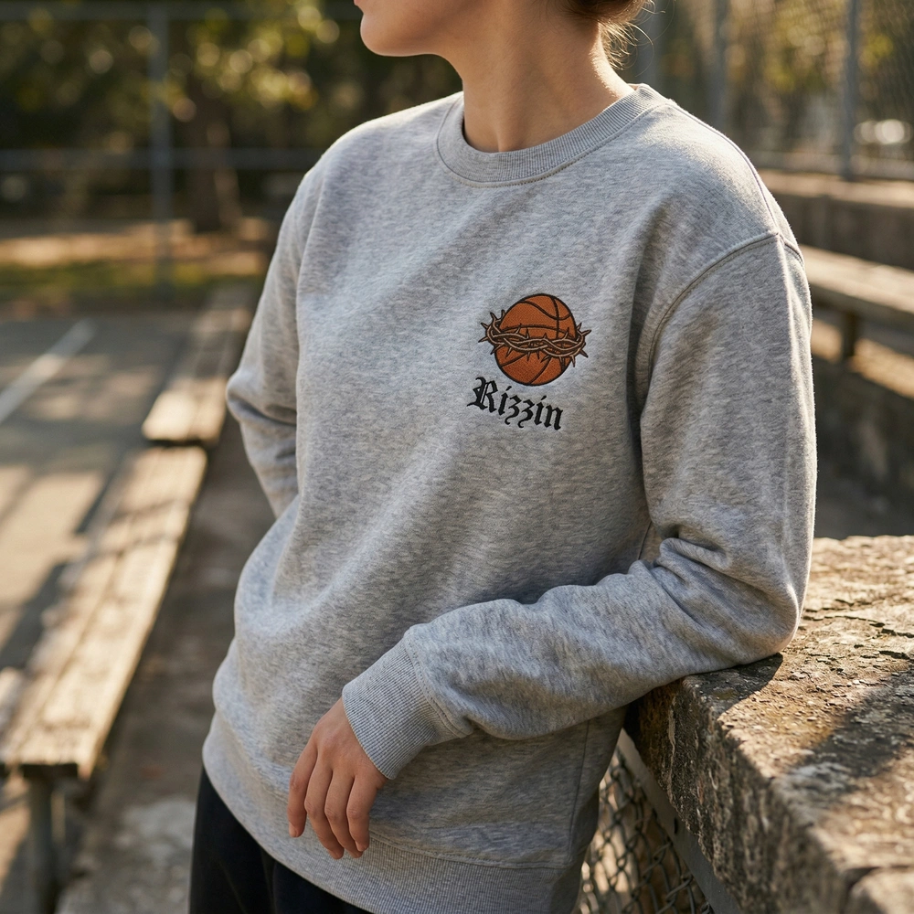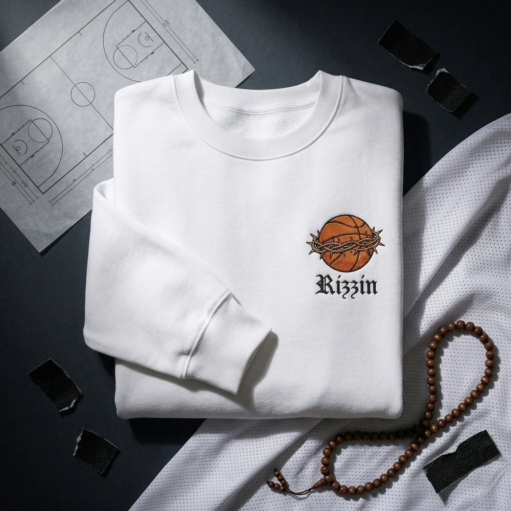 This design is meticulously machine-embroidered on a premium Ash garment, ensuring durability and a high-end feel. The artwork measures 8cm x 8cm and is positioned over the left breast pocket area for a classic streetwear aesthetic. We use three distinct thread colors: #D2691E Leather Orange for the basketball, #5C4033 Thorn Brown for the crown of thorns, and #000000 Black for the minimalist gothic “Rizzin” text. The result is a subtle, detailed graphic that looks like a standard indie logo from a distance but reveals a hilarious jesus basketball meme up close.