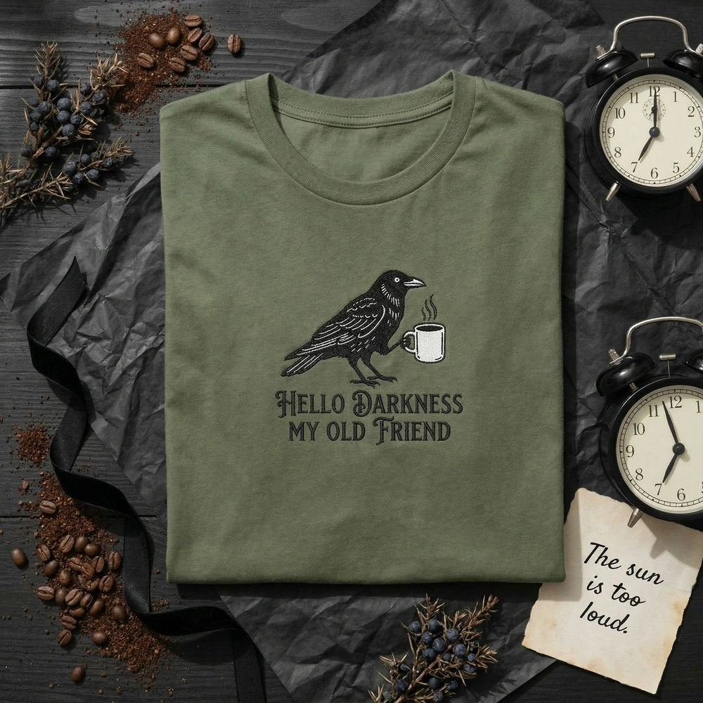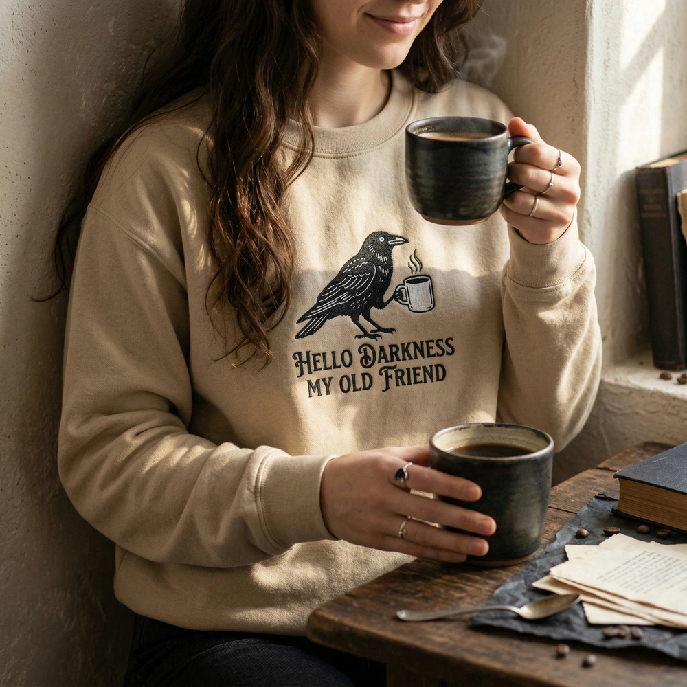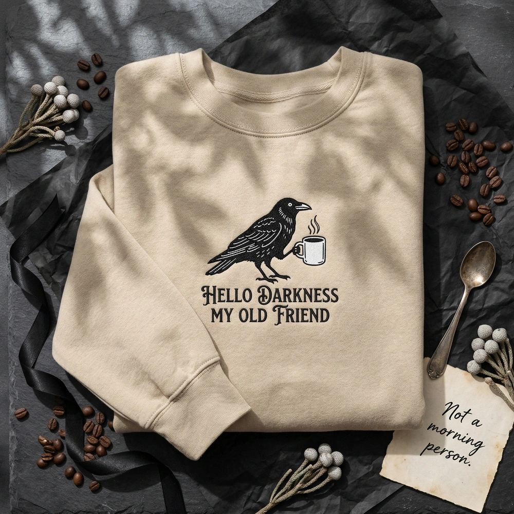 The Hello Darkness My Old Friend Embroidered Sweatshirt is a premium machine-embroidered garment featuring a caffeinated crow — the ultimate mood for coffee lovers.