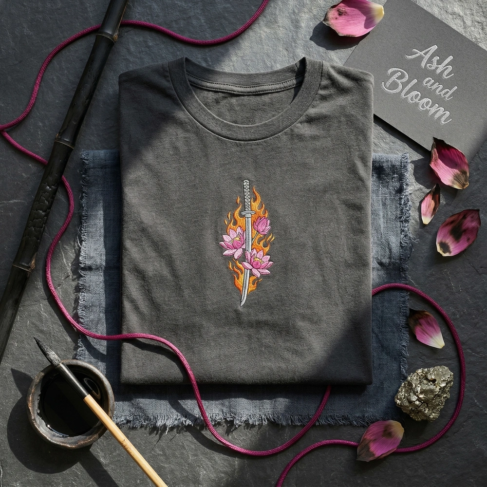 This original design is brought to life using five vibrant thread colors: #C0C0C0 Steel Silver for the katana blade, #FF4500 Fire Orange and #FFD700 Flame Yellow for the aggressive flames, and #FF1493 Lotus Magenta with #FFB6C1 Soft Pink for the blooming flowers. The embroidery measures a substantial 12cm x 22cm, providing a striking vertical presence on the chest of our premium Black garment. Every stitch is placed with precision to ensure the contrast between the burning steel and macabre flowers remains sharp and durable.