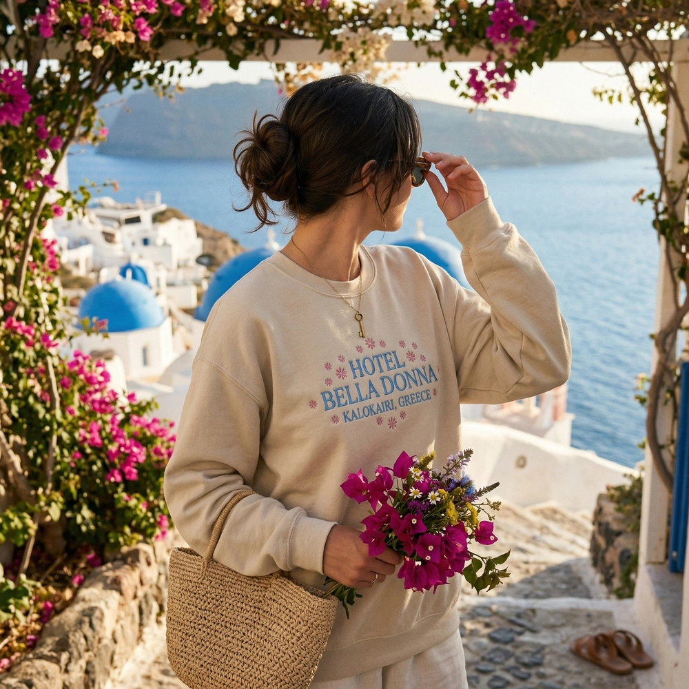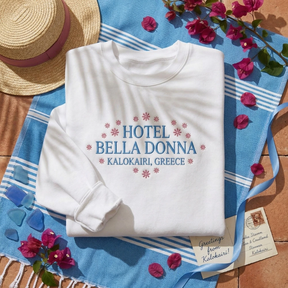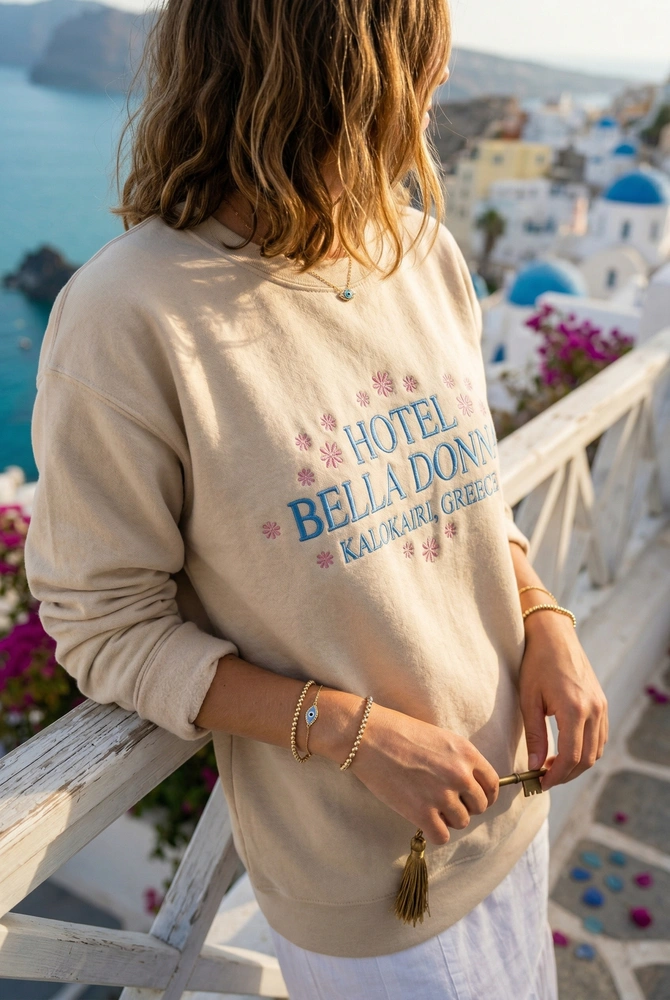 The Hotel Bella Donna Embroidered Sweatshirt is a premium machine-embroidered top featuring a classic Kalokairi Greece travel aesthetic design.