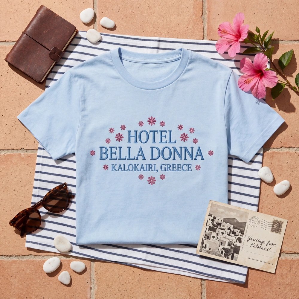 This design is inspired by the fictional hotel and setting from a popular musical movie franchise set in Greece. It captures the essence of a boutique hotel souvenir from a sun-soaked island getaway.