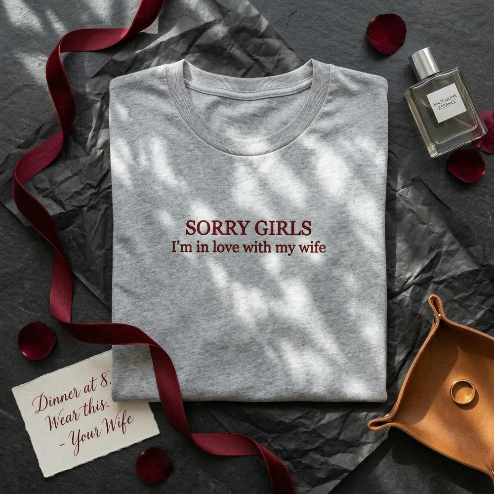 This design is expertly crafted using a single, rich dark red thread (#8B0000) that creates a striking contrast against the crisp white fabric. The embroidery measures 16cm x 6cm and is centered on the chest. We use a dense, premium satin stitch for the ‘SORRY GIRLS’ text to provide a raised, high-end texture, while the subtext ‘I’m in love with my wife’ is rendered in a clean, legible serif running stitch. This minimalist layout ensures the message is clear and the garment remains versatile for everyday wear.