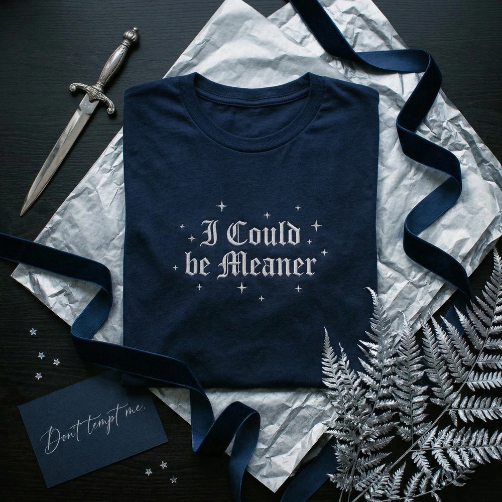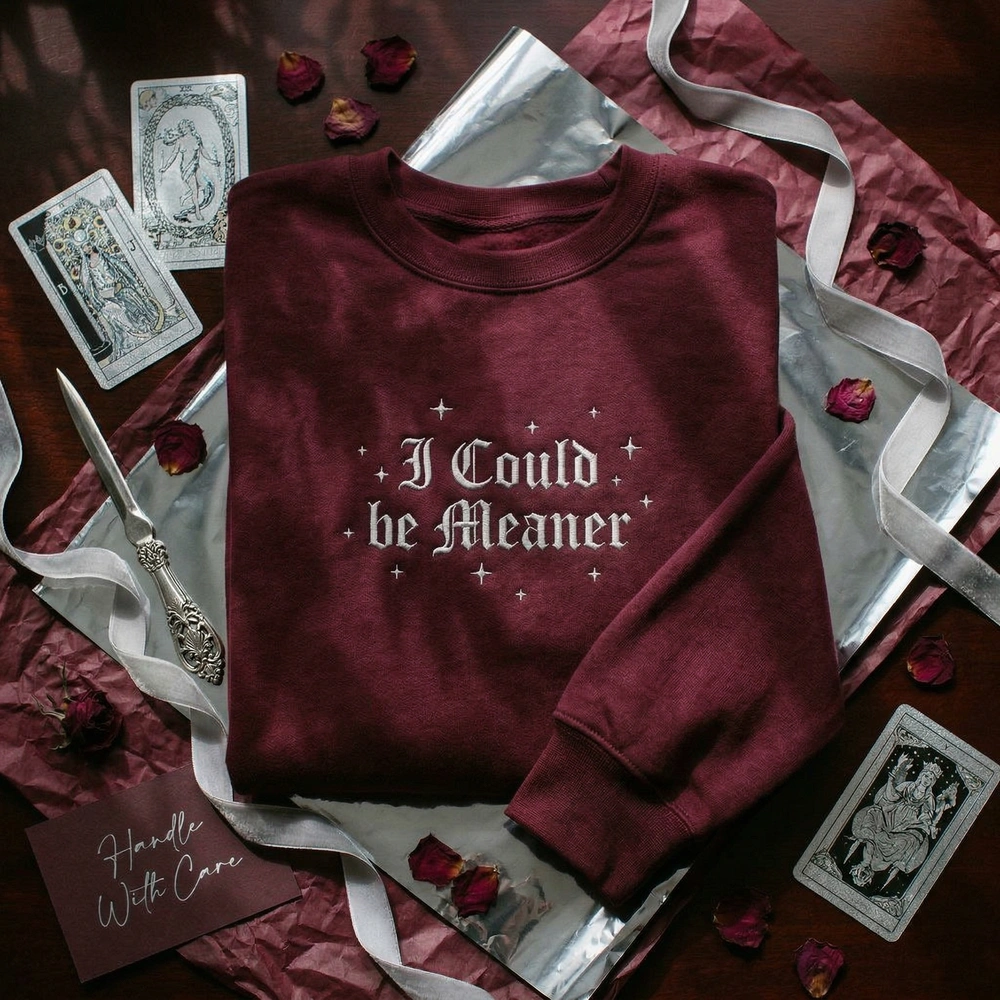 The I Could Be Meaner Embroidered Sweatshirt is a premium gothic font crewneck featuring bold silver-grey embroidery and a sarcastic alt aesthetic.