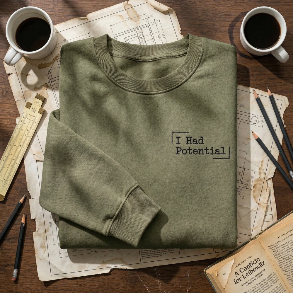The I Had Potential Embroidered Sweatshirt is a premium machine-embroidered top featuring a minimalist typewriter design—ideal for fans of sci-fi irony.