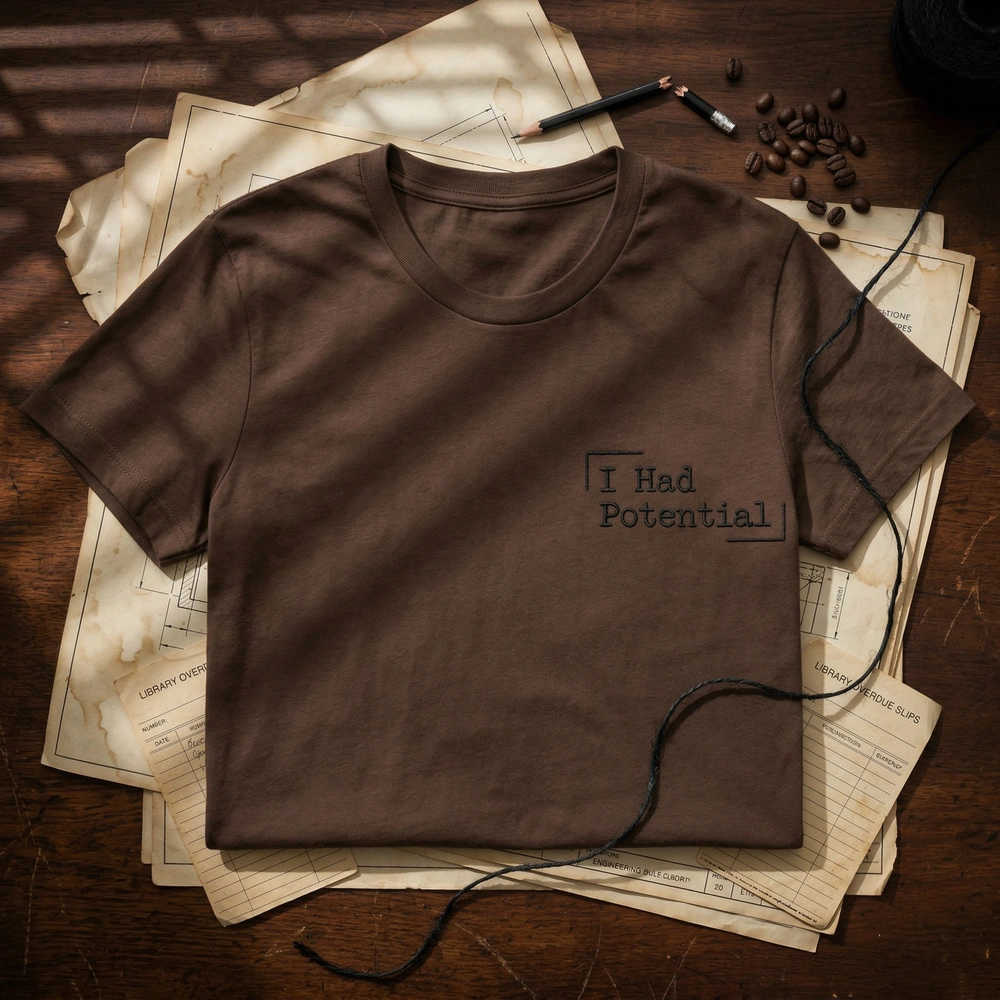 This design is executed with a hyper-minimalist aesthetic on a Sand-colored garment. We use a precise black running stitch to mimic the look of a typewriter or ink stamp, avoiding heavy fills to maintain a delicate, raw feel. The phrase “I Had Potential” is enclosed in a tiny, incomplete stitched rectangle (9cm x 4cm), visually representing the unfinished nature of unfulfilled potential. The stark black thread (#000000) against the neutral sand fabric creates a sophisticated, academic look that is both quiet and impactful.
