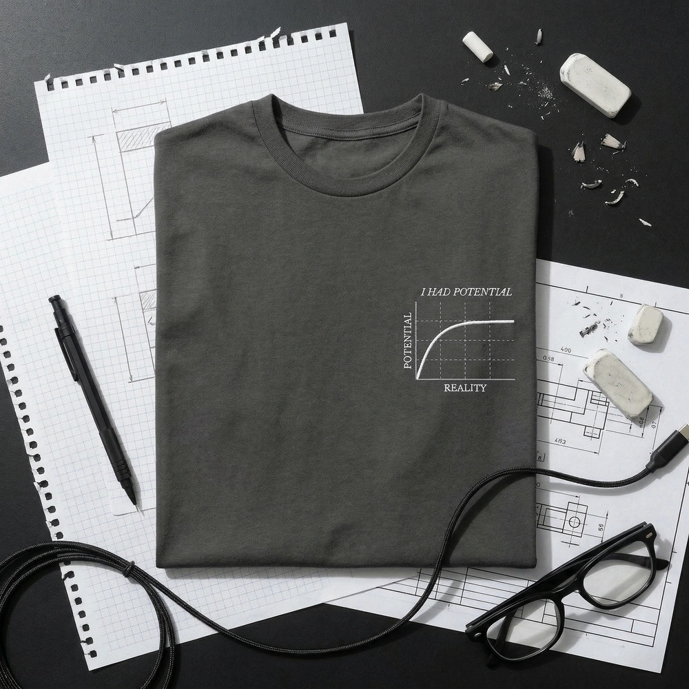 This design is a playful, technical take on the gap between expectation and reality. It mimics a scientific graph where the ‘potential’ line unfortunately flattens out, making it a relatable piece for anyone in high-pressure academic or technical fields.