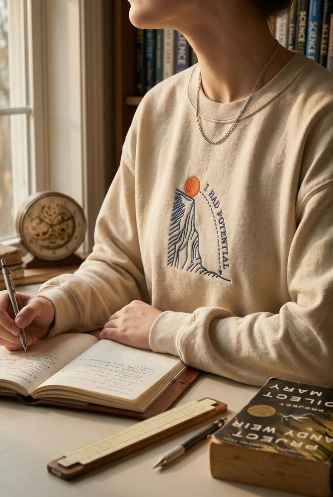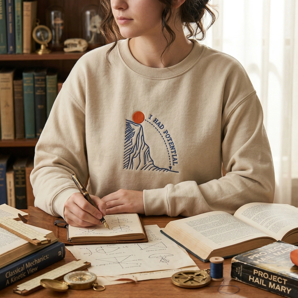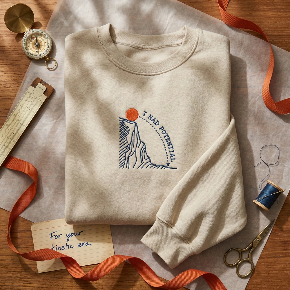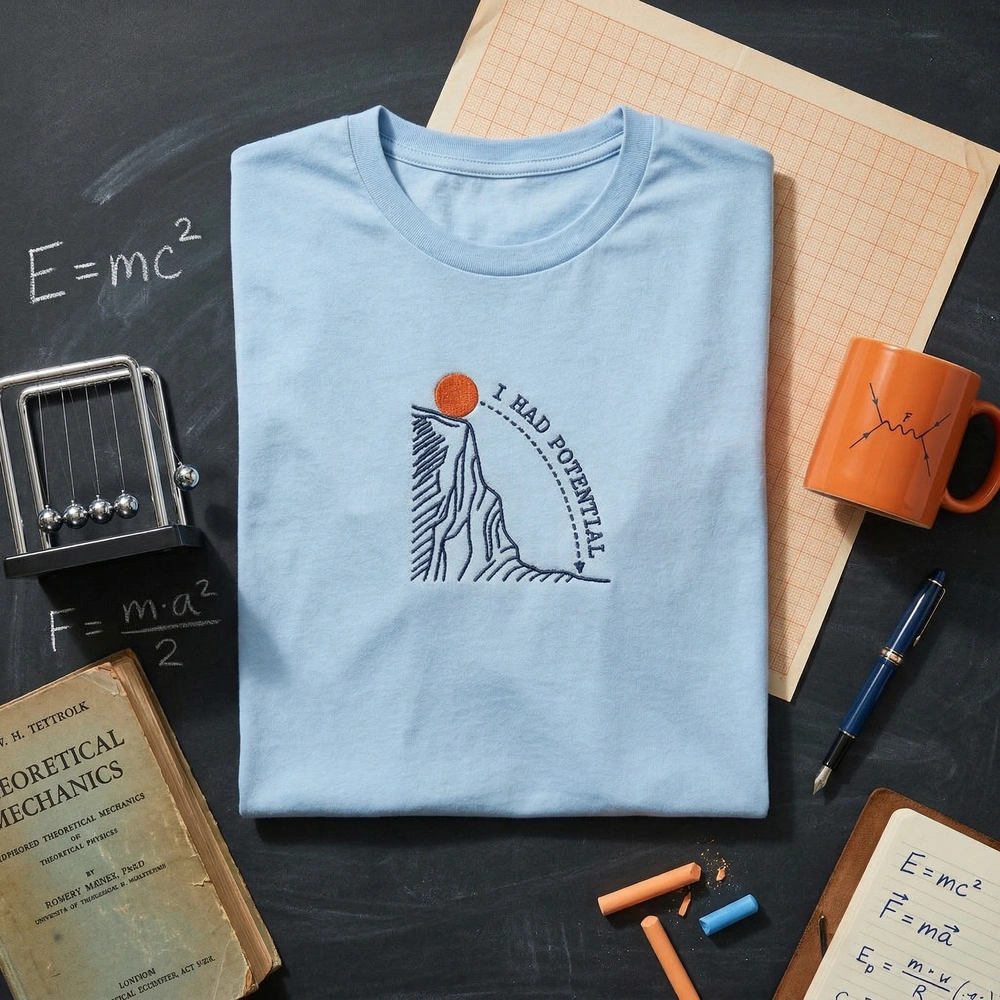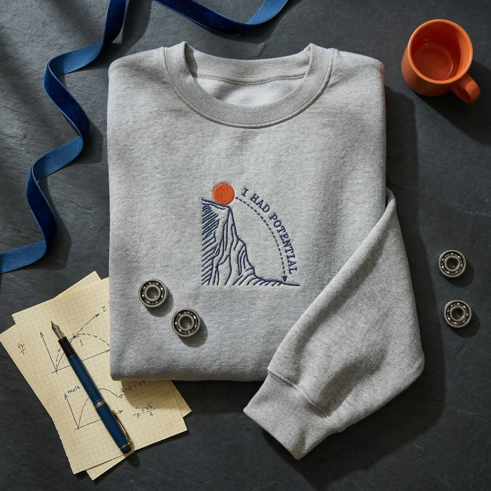 This design is meticulously rendered using high-quality embroidery techniques on a soft Sand-colored garment. The artwork features a sleek, minimalist line-art drawing of a steep cliff with a solid-filled ball at the apex. A delicate, dotted trajectory line curves downward, accompanied by the text “I HAD POTENTIAL” in a retro typewriter font. We use a sophisticated two-color palette of #2C3E50 Ink Blue and #E67E22 Retro Orange. The embroidery measures 15cm x 15cm, making it a bold yet tasteful statement piece for any science enthusiast.