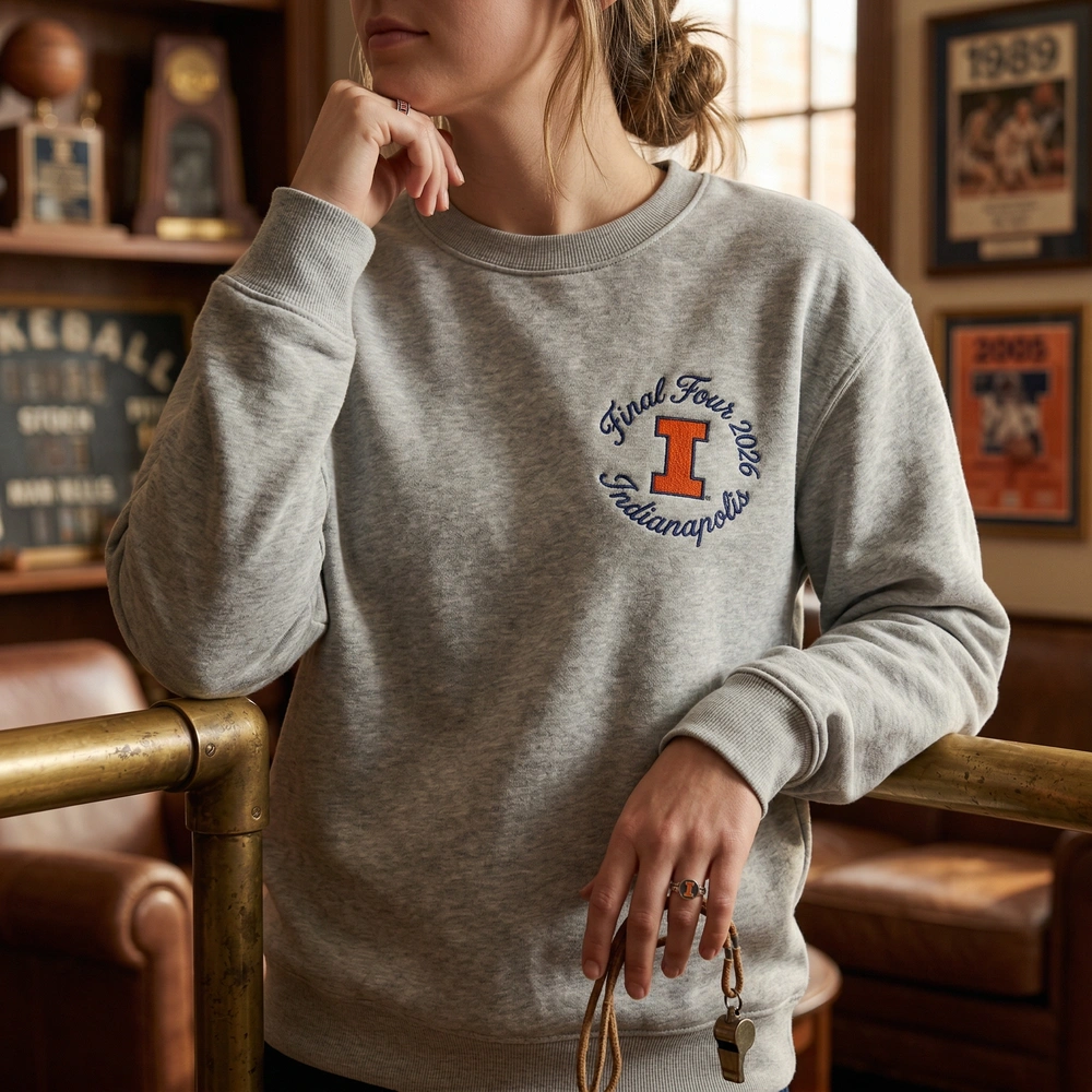 The Illini Final Four 2026 Embroidered Sweatshirt is a premium commemorative garment featuring a massive vintage-inspired chainstitch design for dedicated fans.