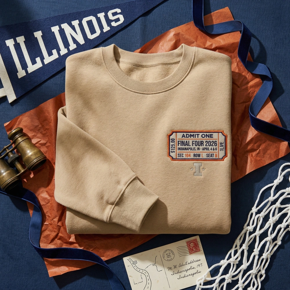 The Illinois Final Four Embroidered Sweatshirt features a minimalist 2026 basketball ticket stub design, perfect for fans of subtle streetwear style.