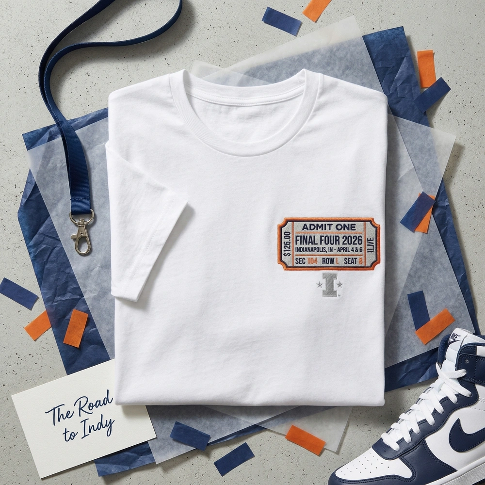 This original design is meticulously machine-embroidered on the left chest pocket area of a premium Sport Grey garment. The design mimics a vintage basketball game ticket stub, measuring 8cm x 12cm. It utilizes a sophisticated 3-color palette including Illini Navy (#13294B), Illini Orange (#E84A27), and classic Black. Key elements include the “ADMIT ONE” header, “FINAL FOUR 2026” text, and the iconic Block “I” logo acting as a subtle watermark in the center. The bottom of the stub commemorates the location: “INDIANAPOLIS, IN – APRIL”.