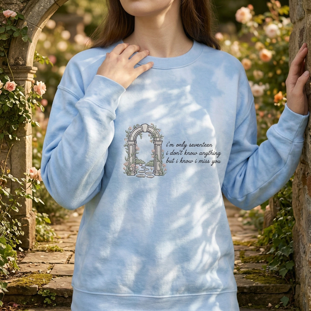 The I’m Only Seventeen Embroidered Sweatshirt features a nostalgic garden archway design, perfect for fans of indie-folk music and cottagecore style.