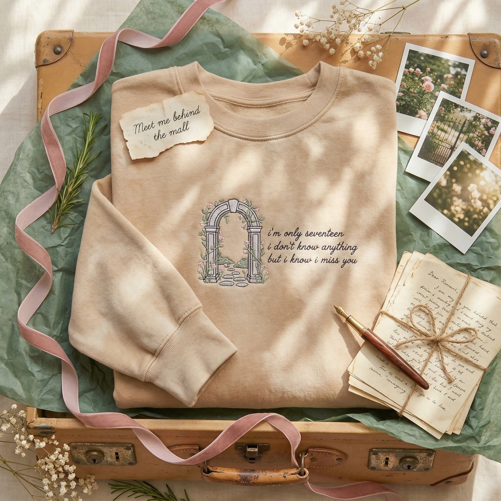 Relive the bittersweet nostalgia of youthful love and the whimsical aesthetic of your favorite album with this beautifully detailed tribute to a poignant lyric. This garment is designed for those who find beauty in the bittersweet and magic in the mundane. Whether you are heading to a concert or enjoying a quiet afternoon at a cafe, this piece connects you to a community of music lovers. Browse more embroidered sweatshirts | swiftie merch in our collection to find your next favorite look.