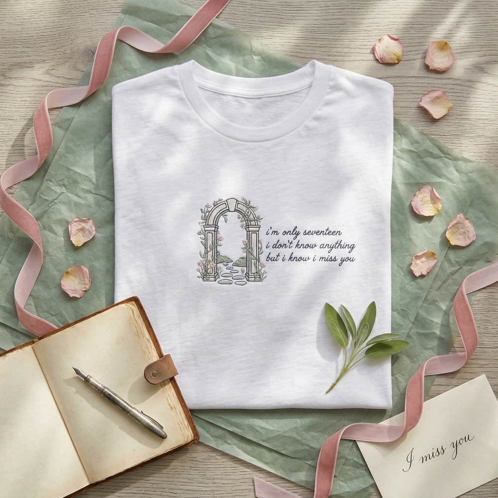 This intricate embroidery design is centered on a premium Light Blue sweatshirt, measuring approximately 18cm x 12cm. The composition features a classical garden trellis rendered in light grey fill stitches with dark grey running stitch outlines for a vintage architectural feel. Climbing vines in muted sage green satin stitches provide a raised, tactile texture, accented by delicate pale pink floral details. A path of irregular stepping stones leads the eye toward the handwritten-style cursive lyrics, stitched in sharp dark grey for maximum legibility. We use four distinct thread colors to ensure a high-quality, professional finish that stands out.