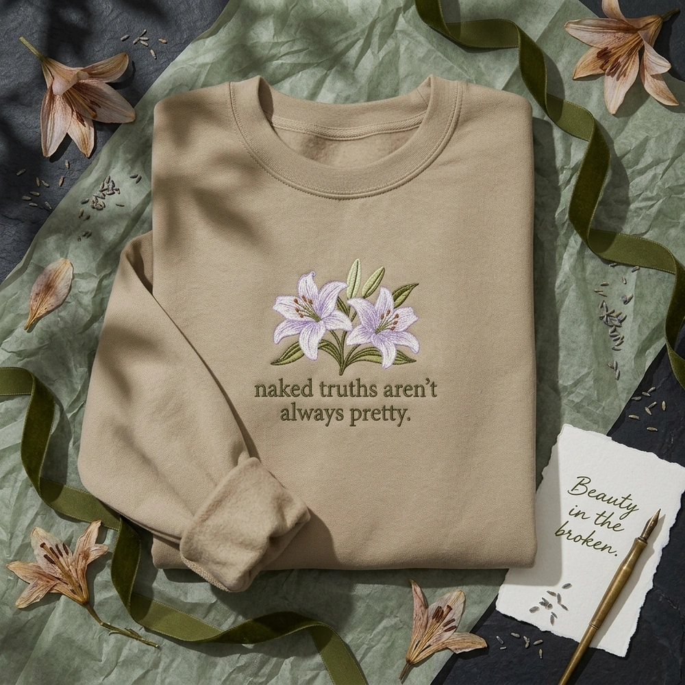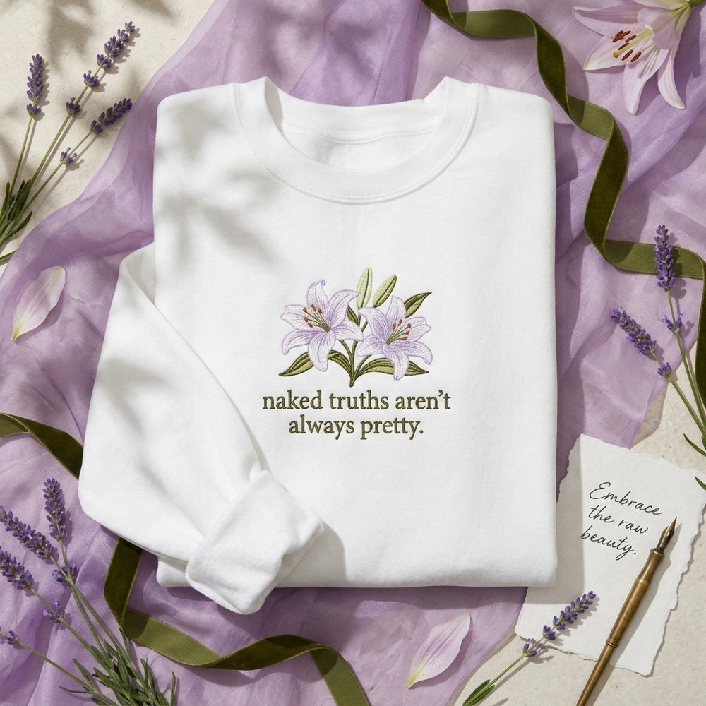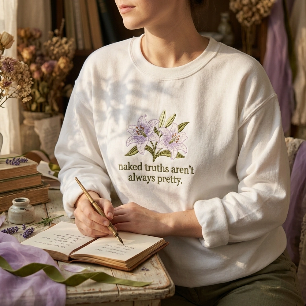 This garment captures the essence of the ‘sad girl’ aesthetic, blending delicate botanical beauty with the vulnerable truth that ‘naked truths aren’t always pretty.’ It is designed specifically for poetry enthusiasts and cottagecore fans who appreciate high-quality, meaningful fashion. Whether you are layering for a cozy coffee shop date or expressing your inner world through your style, this top serves as a wearable piece of art. Browse more embroidered sweatshirts or find your next favorite bookish sweatshirt in our curated collection.