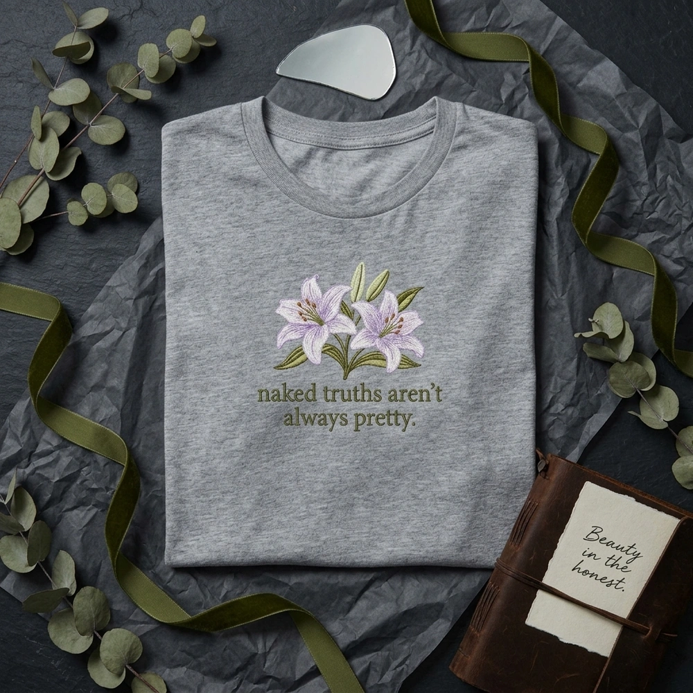This design is meticulously crafted on a premium white garment to make the vibrant thread colors pop. The centerpiece features two blooming lilies in soft lavender (#E6E6FA) with crisp white highlights and intricate shading for a realistic, textured feel. The floral element is framed by light green leaves with dark green veining, while the stamen are detailed with tiny orange and brown stitches. Below the flowers, the phrase ‘naked truths aren’t always pretty.’ is embroidered in a dark olive green satin stitch, following a staggered, curved layout. The entire design measures approximately 12cm wide by 10cm high and uses 6 distinct thread colors for maximum depth.