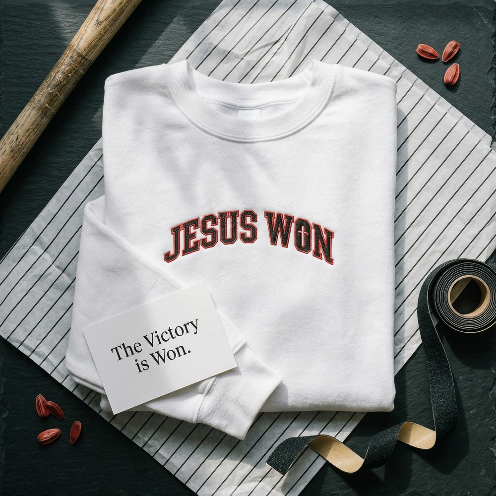 The Jesus Won Embroidered Sweatshirt is a premium machine-stitched top featuring bold athletic block lettering—perfect for Christian baseball fans.