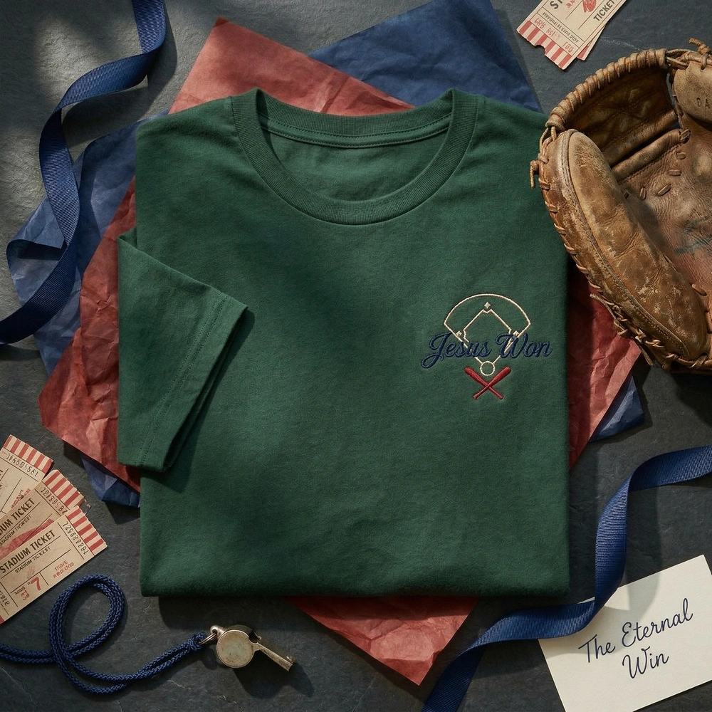 This design is inspired by the “Jesus Won” apparel popularized by professional baseball players who use their platform to share their faith. It represents the ultimate spiritual victory through the lens of America’s favorite pastime.