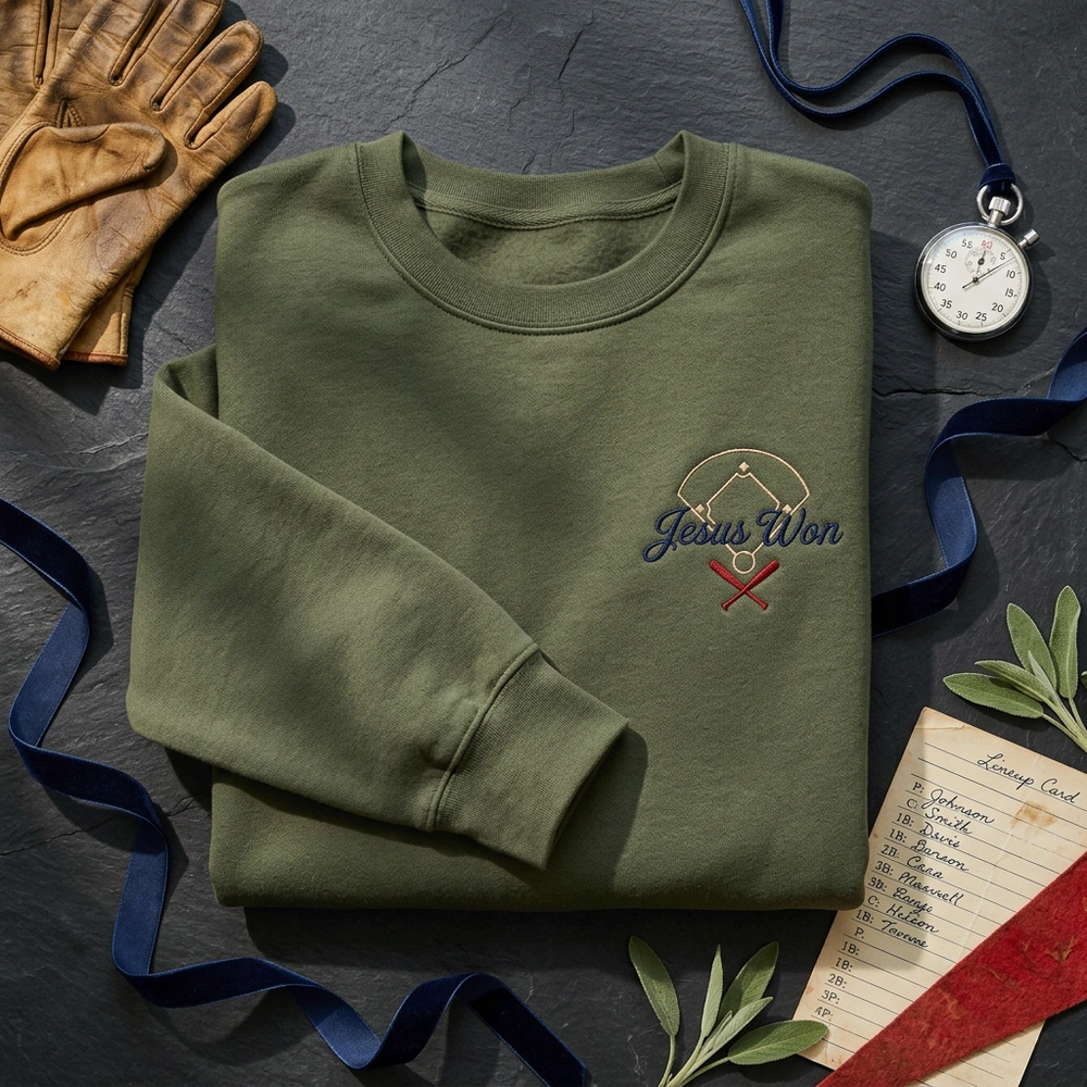The Jesus Won Embroidered Sweatshirt is a premium machine-embroidered sand pullover featuring a vintage baseball diamond design for Christian athletes.