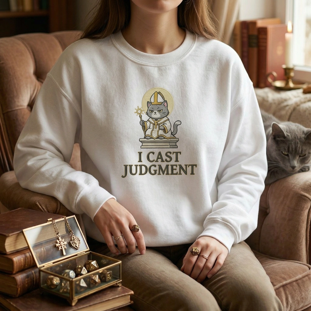 The Judgy Cat Embroidered Sweatshirt features a condescending cat cleric casting judgment. Perfect for cat lovers and D&D players who know cats are gods.