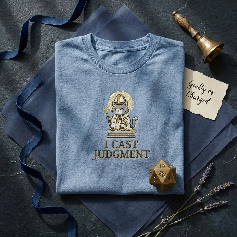 This intricate design features a small cartoon cat perched on a high pedestal, draped in a detailed white and gold cleric’s robe. The embroidery captures the ultimate “disappointed parent” expression with one raised eyebrow and half-lidded eyes. A subtle divine halo glows behind the cat’s head, while the cat holds a tiny glowing staff topped with a sun symbol. Rendered in five premium thread colors—including metallic gold accents for the robes and halo—the 13cm x 17cm design is professionally stitched onto a crisp white garment for maximum contrast. The solemn gothic font below the pedestal reads “I CAST JUDGMENT,” completing the divine aesthetic.