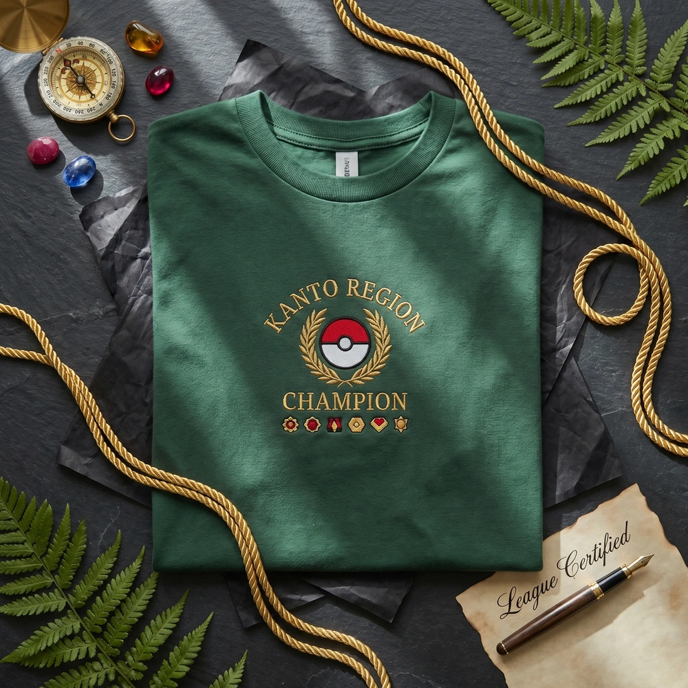 The Kanto Region Champion Embroidered Sweatshirt is a premium machine-stitched top featuring a nostalgic collegiate crest for retro gaming fans.